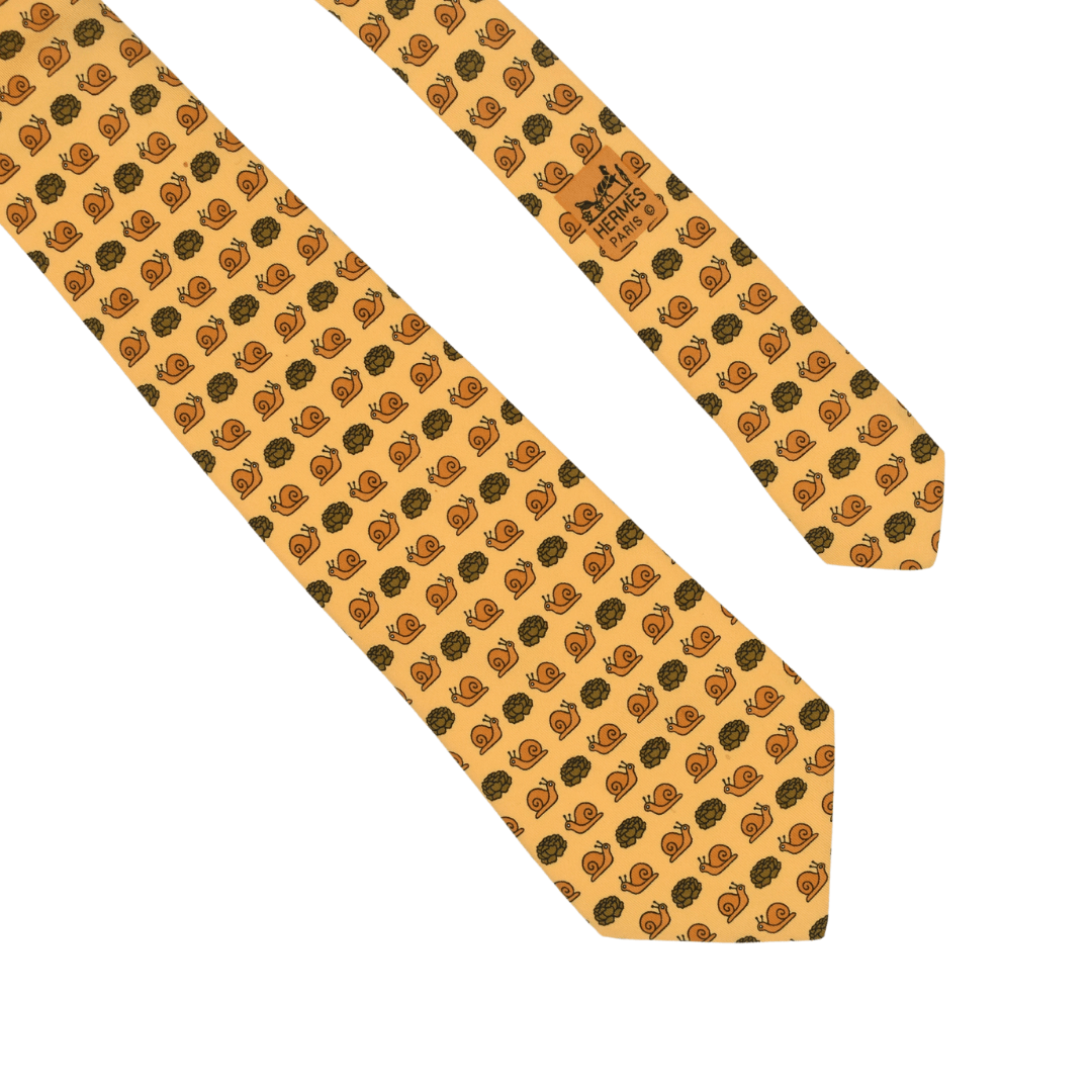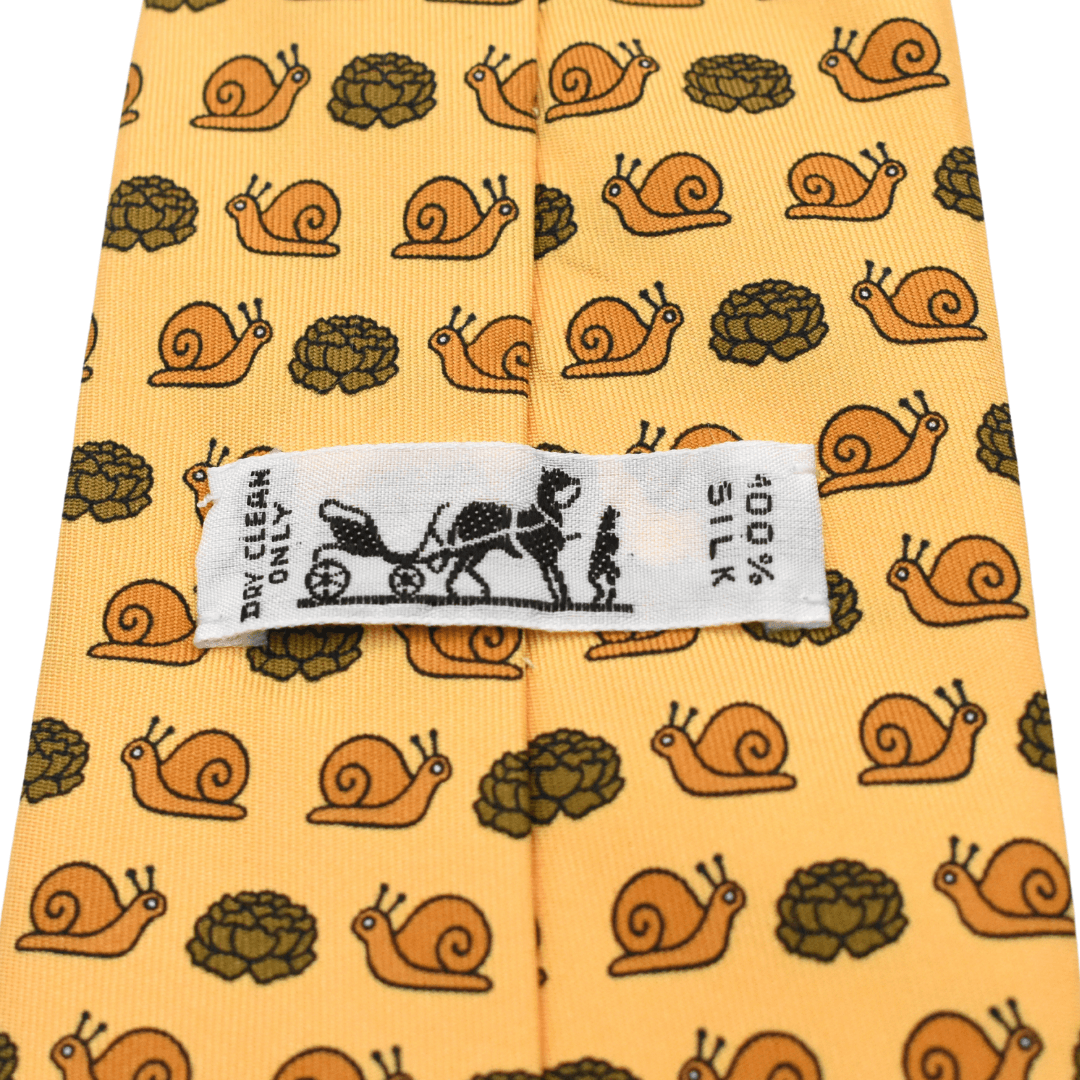 Hermes silk tie in yellow with mustard snail and artichoke print all-over.