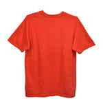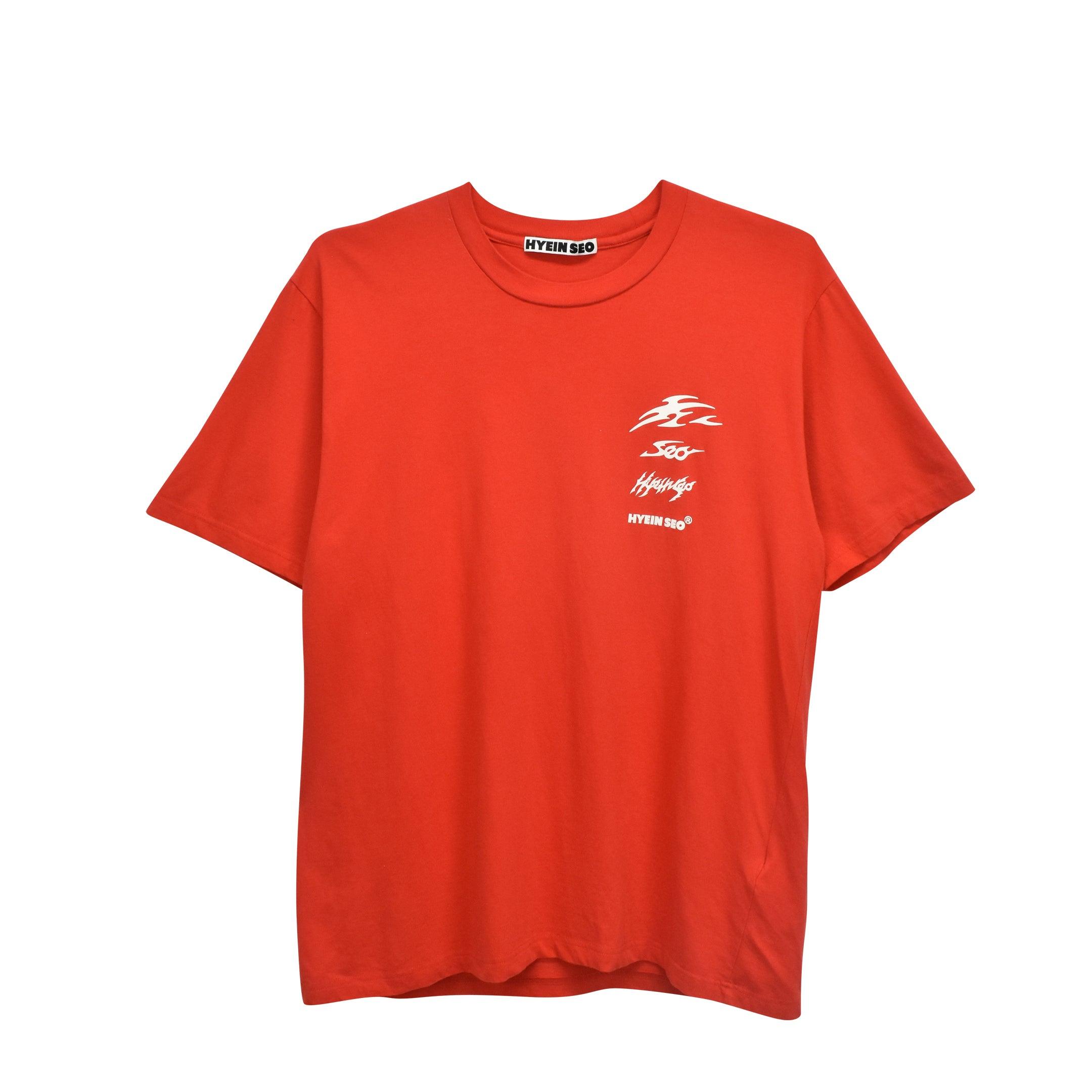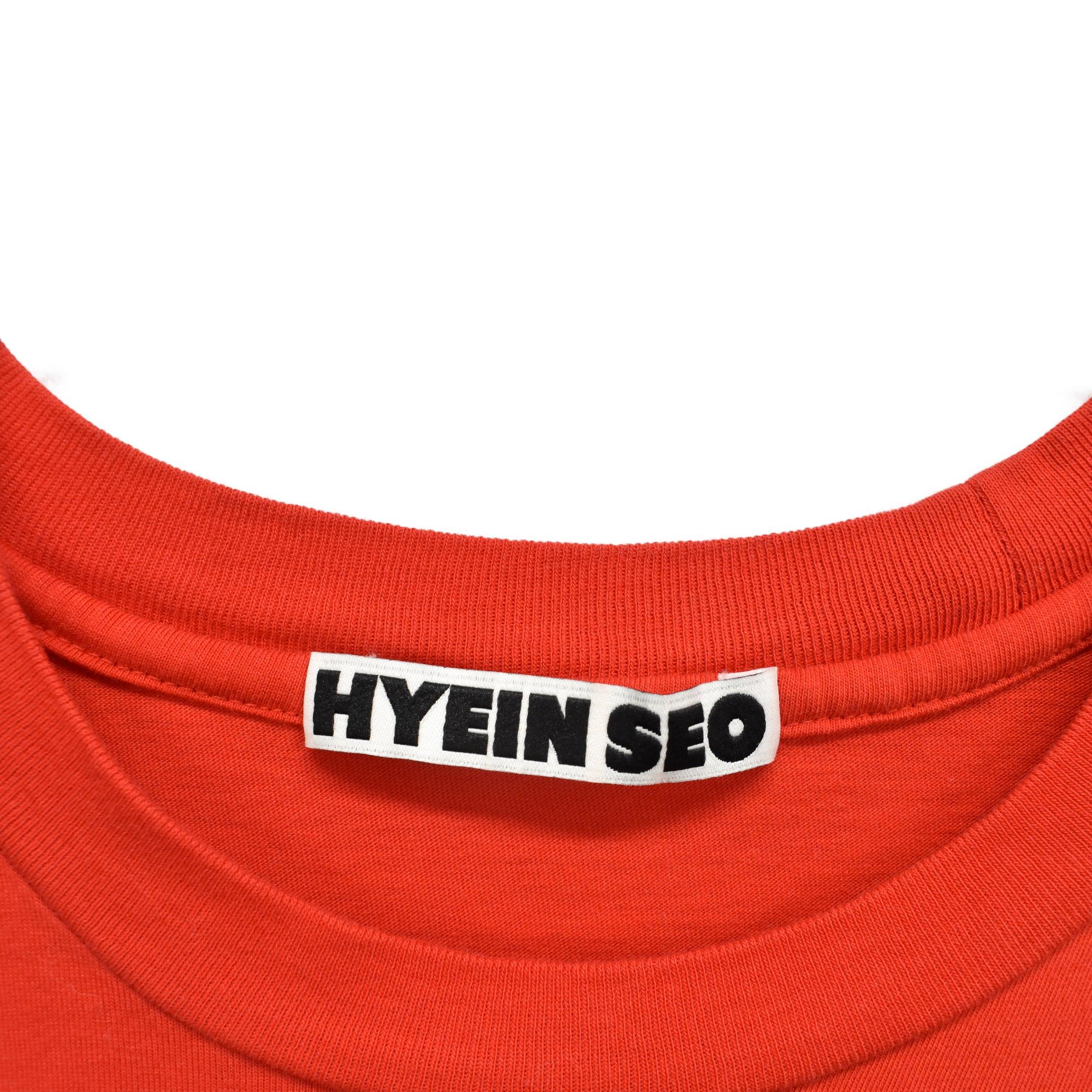 Hyein Seo red boxy fit t-shirt with reflective white logo print on the chest.