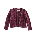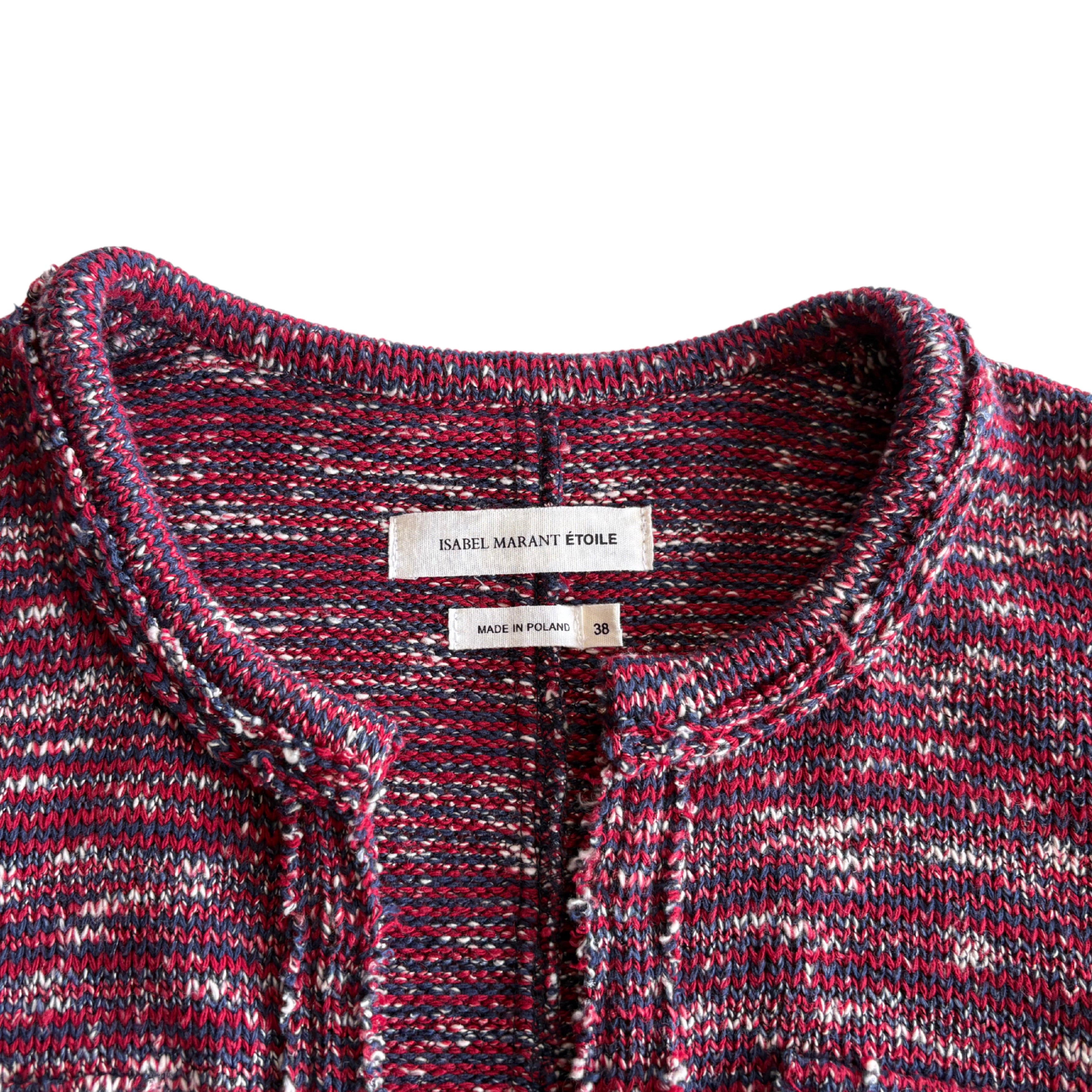 Isabel Marant Etoile 'Ariana' cropped cardigan sweater in red, white and navy knit wool with boucle trim and front pockets.
