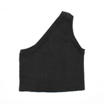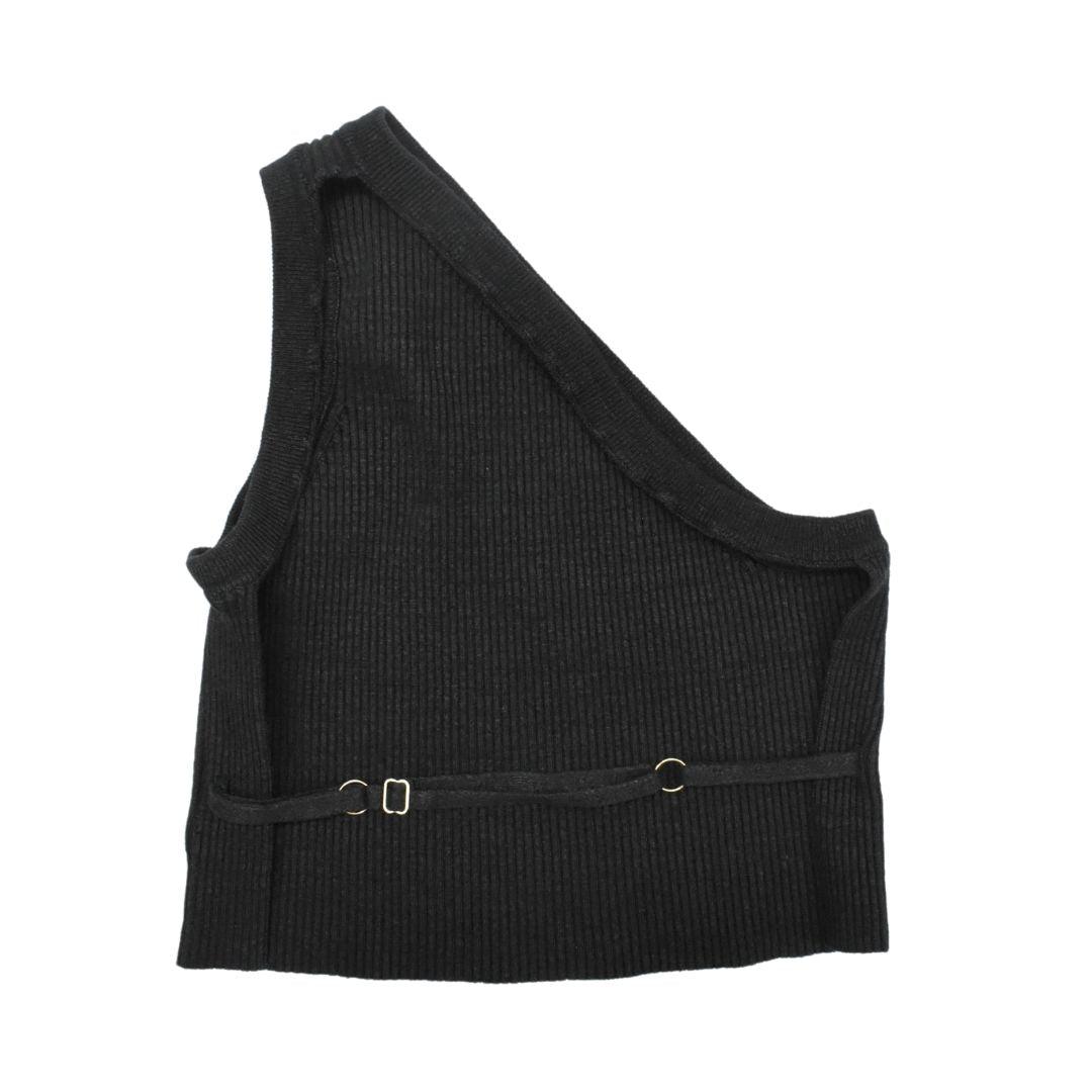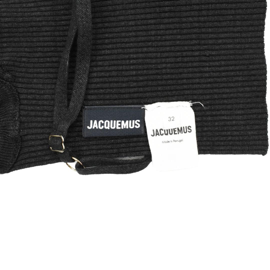 Jacquemus cropped top in a black ribbed linen blend material with an asymmetrical neckline and an adjustable harness strap across the open back.