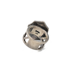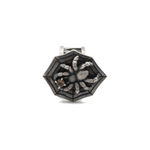 Jean Paul Gaultier necklace and ring set in brushed gunmetal-toned sterling silver. The necklace features a thin chain with a gunmetal hardware spider pendant with a smoky gemstone on the top, an elongated chain drop, and lobster clasp closure. The ring features a triangle cutout band, a solid web detail, and a spider on top with a smoky gemstone.
