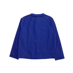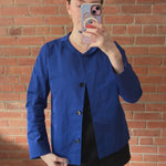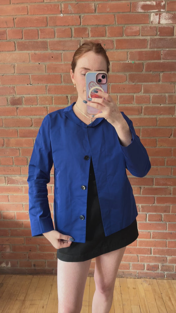 Jil Sander short jacket in royal blue nylon with a hidden front button closure with black buttons, slip pockets, and a small collar.
