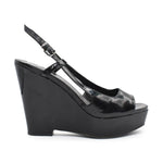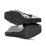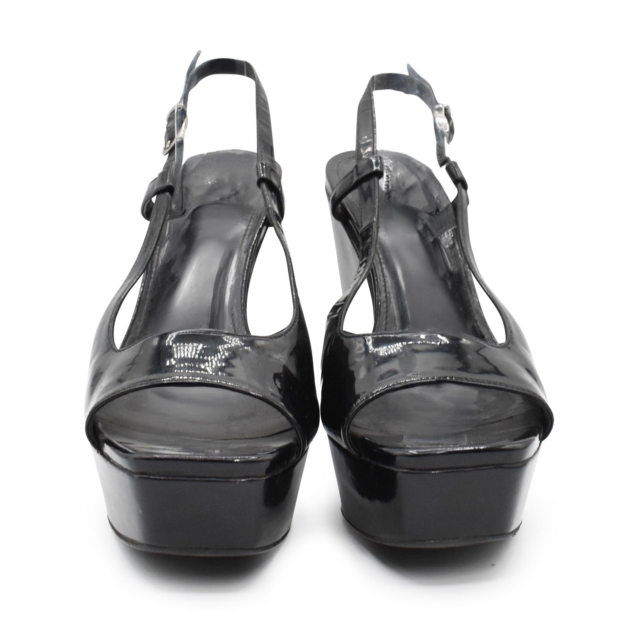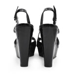 Jil Sander wedge heels in black patent leather with a peep-toe and ankle strap closure.