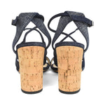 Jimmy Choo strappy heels in dark blue denim with an open toe, a small buckle closure on the ankle in silver hardware, and a beige cork heel.