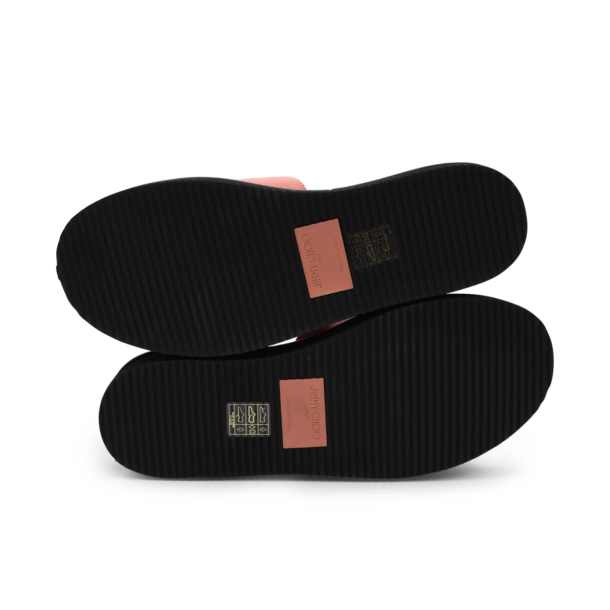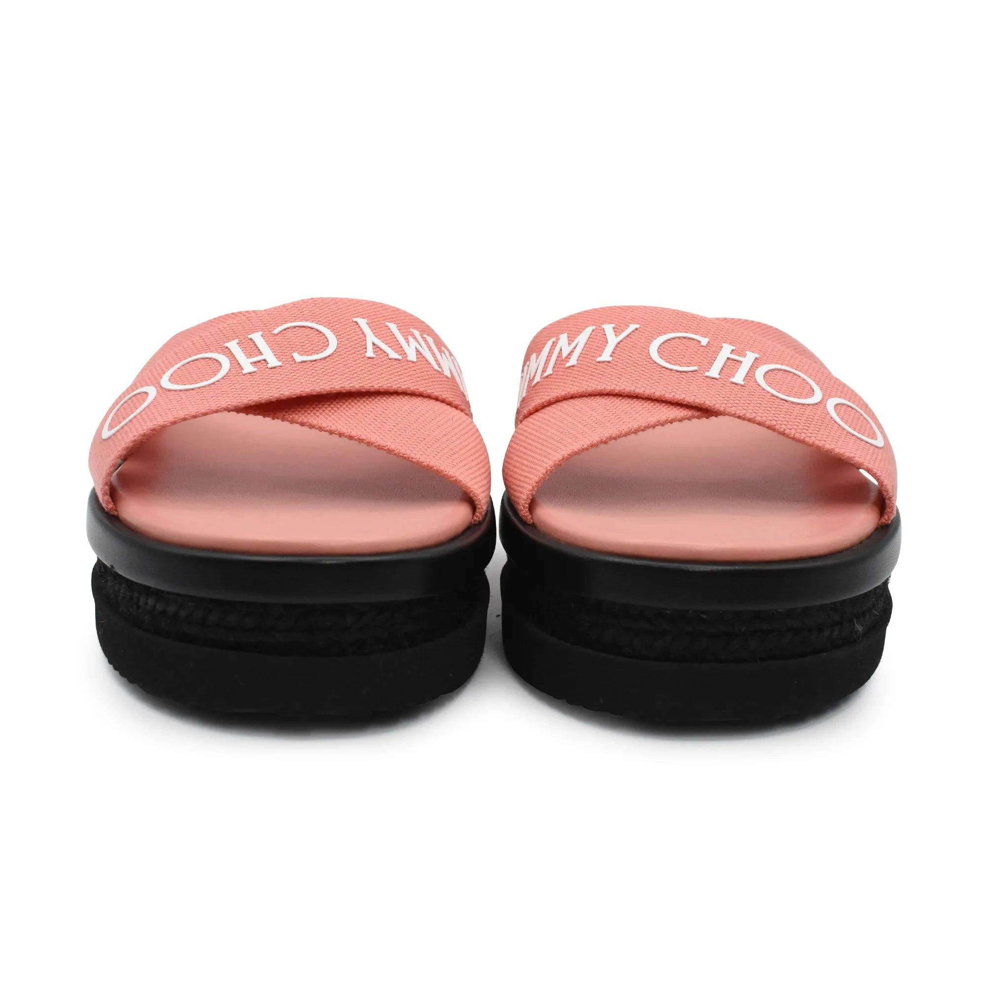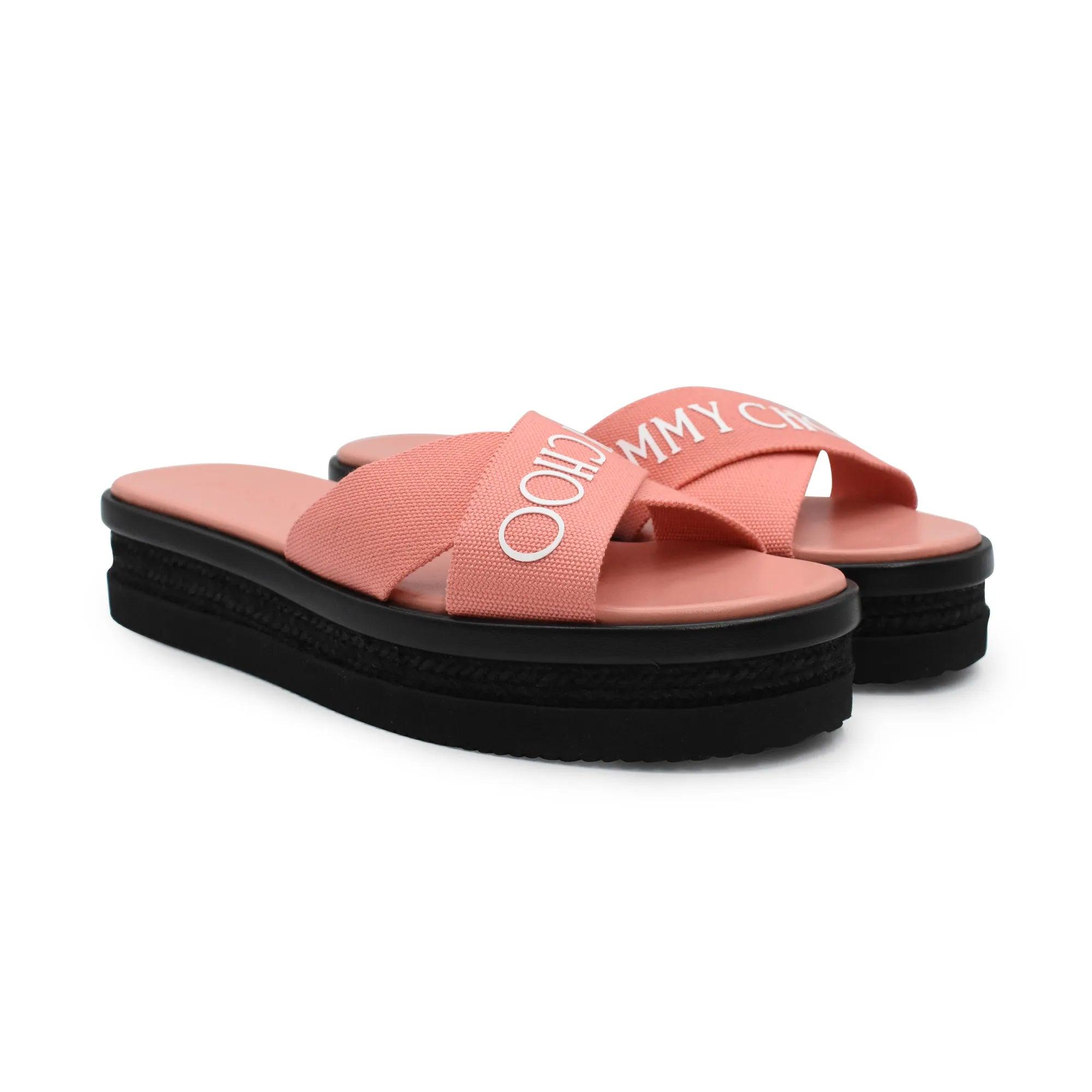 Jimmy Choo 'Joy' platform espadrille sandals in salmon pink and black. Features a criss-cross strap in pink canvas with large logo in white, pink and black leather sole, and a jute twine platform.