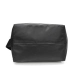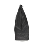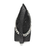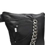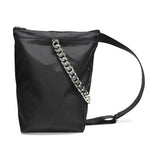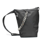 Kara 'Sling Backpack' shoulder bag in black nylon. Features an adjustable strap, pant-shape design with jean-esque detailing, large silver chain, and zipper closure.