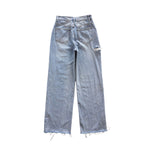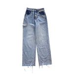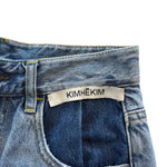 Kimhekim straight-leg jeans in medium wash denim with a side ripped detailing, darker wash pockets and distressed hem. Features a front button and zip fastening, belt loops and a logo patch to the side.