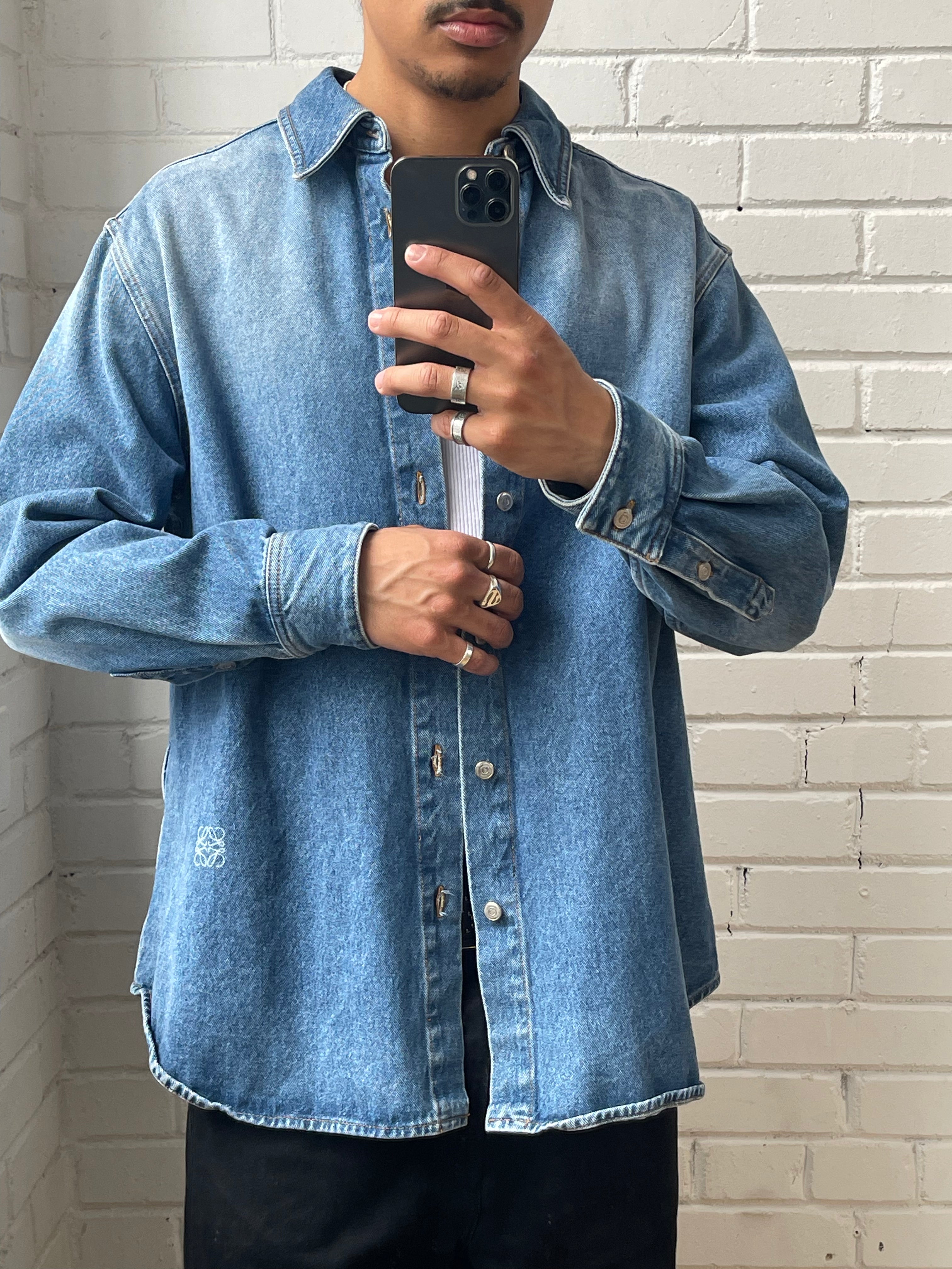 Loewe shacket in heavy blue denim with a front-button closure with silver buttons, a point collar, and a faded logo at the bottom hem.