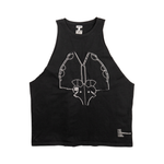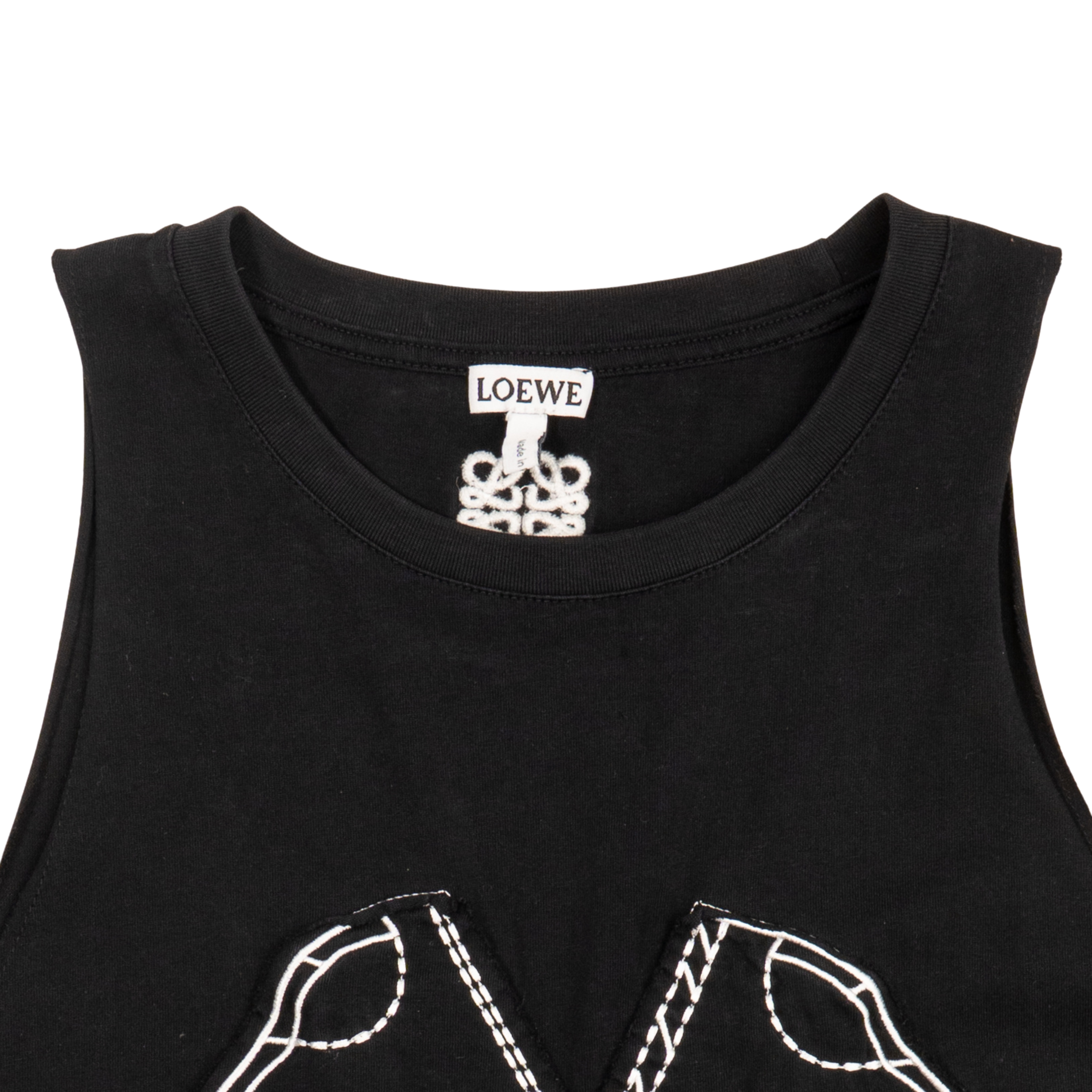 Loewe 'Elephant Embroidery' top, t-shirt sleeves have been removed to make it a tank top with with white elephant embroidered graphic on the front. Features a ribbed neckline, faux sewing instructions on the front, and a small, white embroidered logo at the back of the neck.
