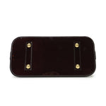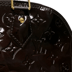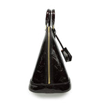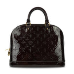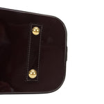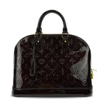 Louis Vuitton 'Alma PM' handbag in amarante vernis monogram leather with gold hardware. Features two rolled top handles, a top-zip opening, and hardware feet on the bottom.