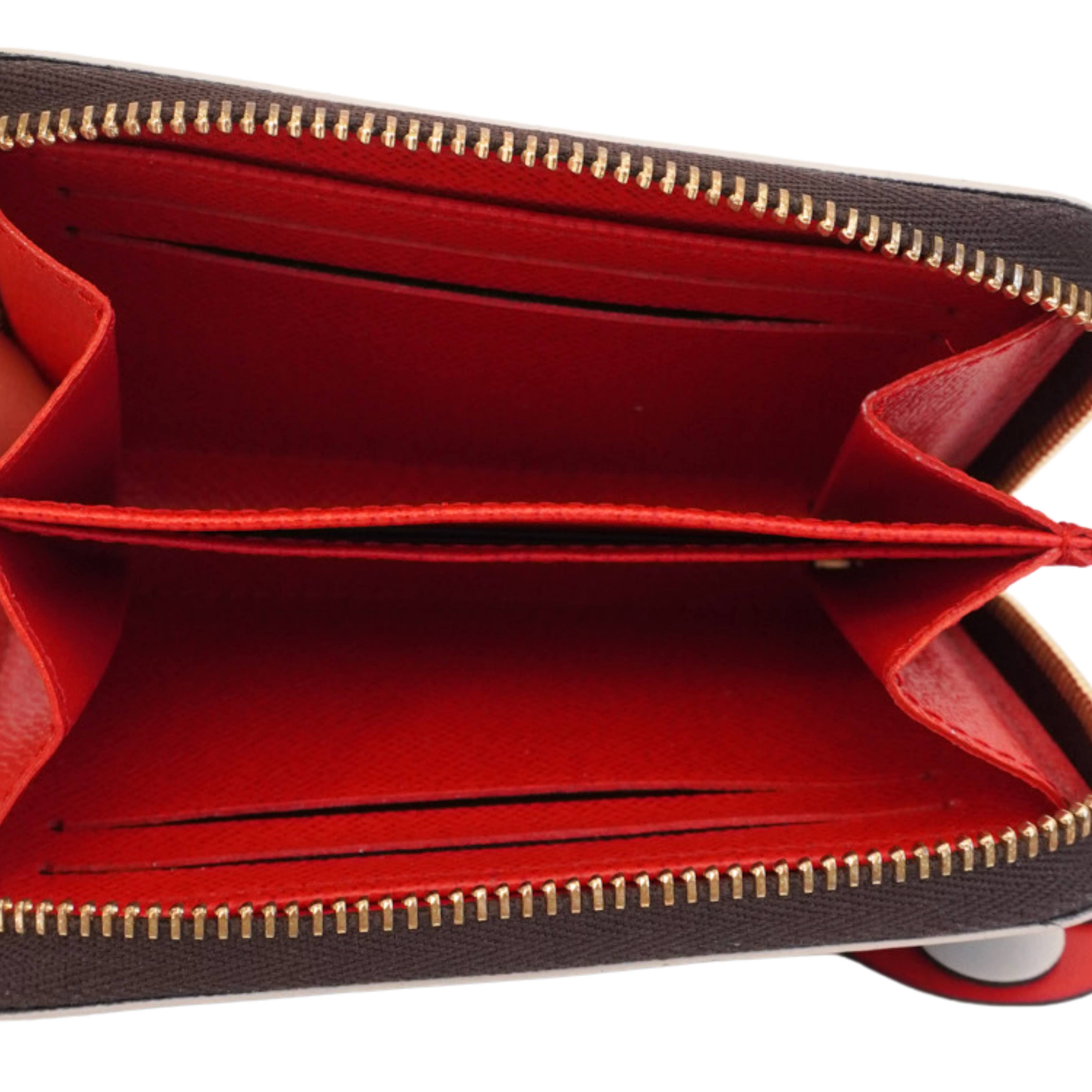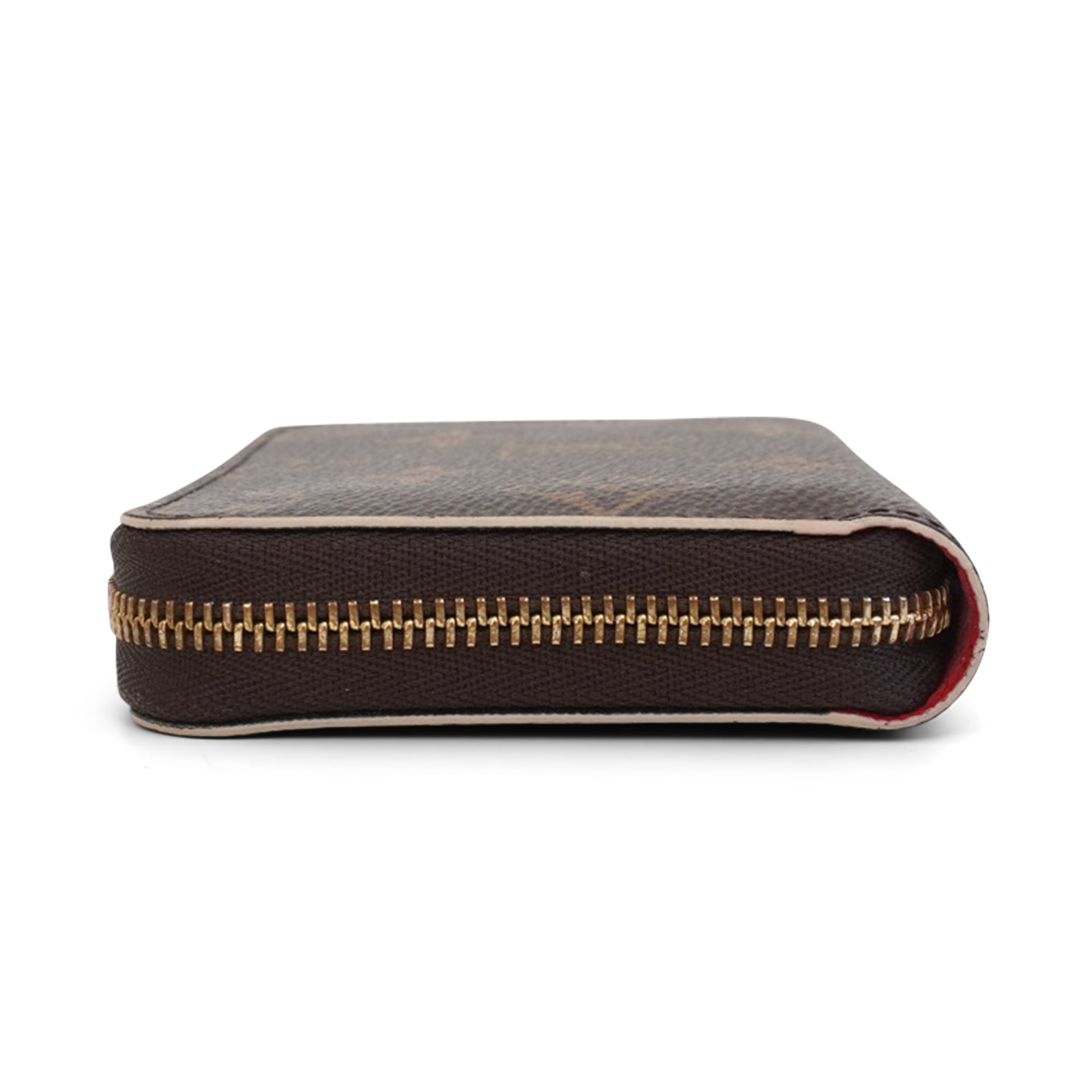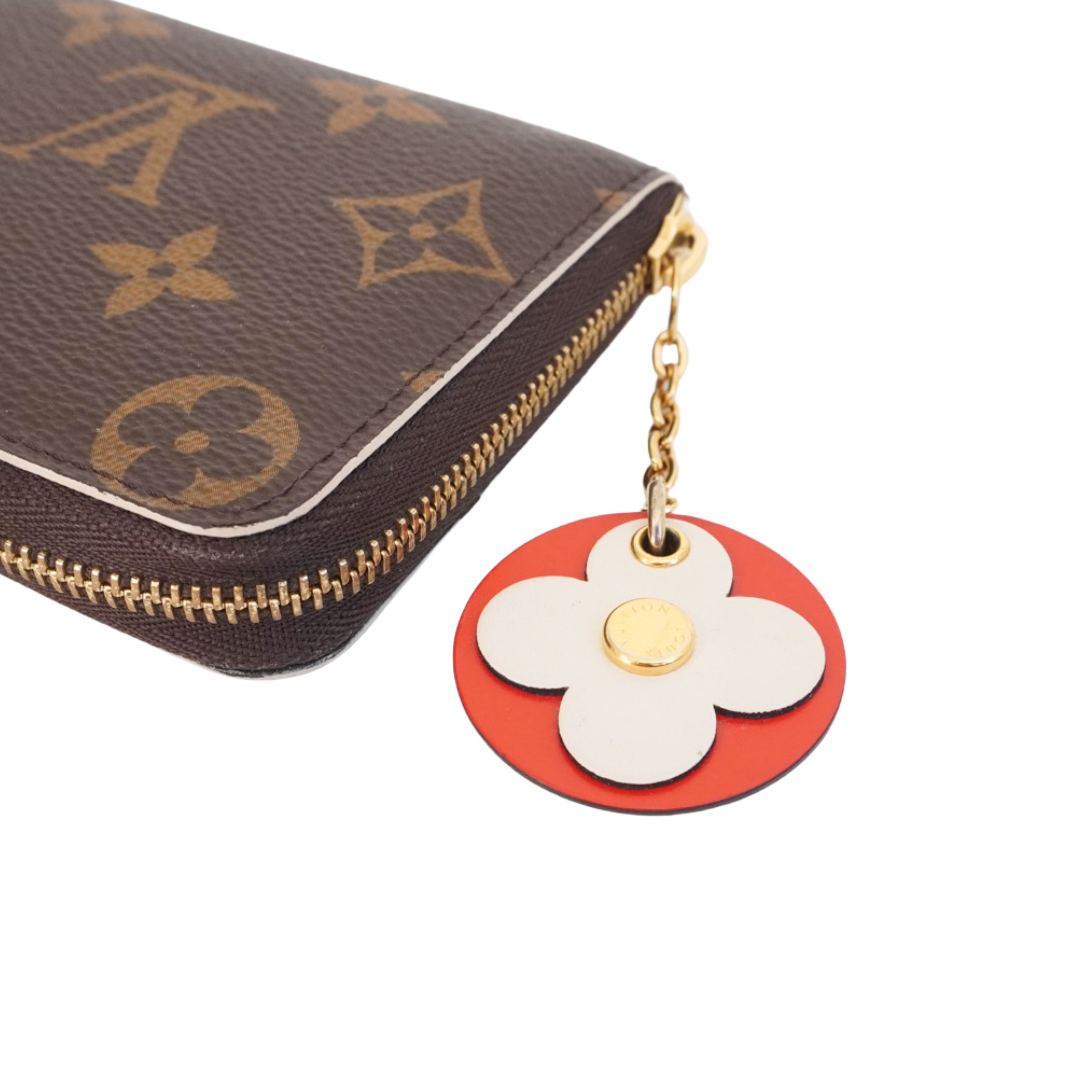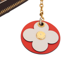 Louis Vuitton 'Lisa' zip wallet in brown monogram coated canvas with red interior. Features a red and white flower charm on zipper pull, seven inner card slots, and two open compartments.