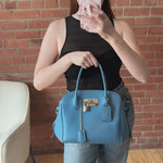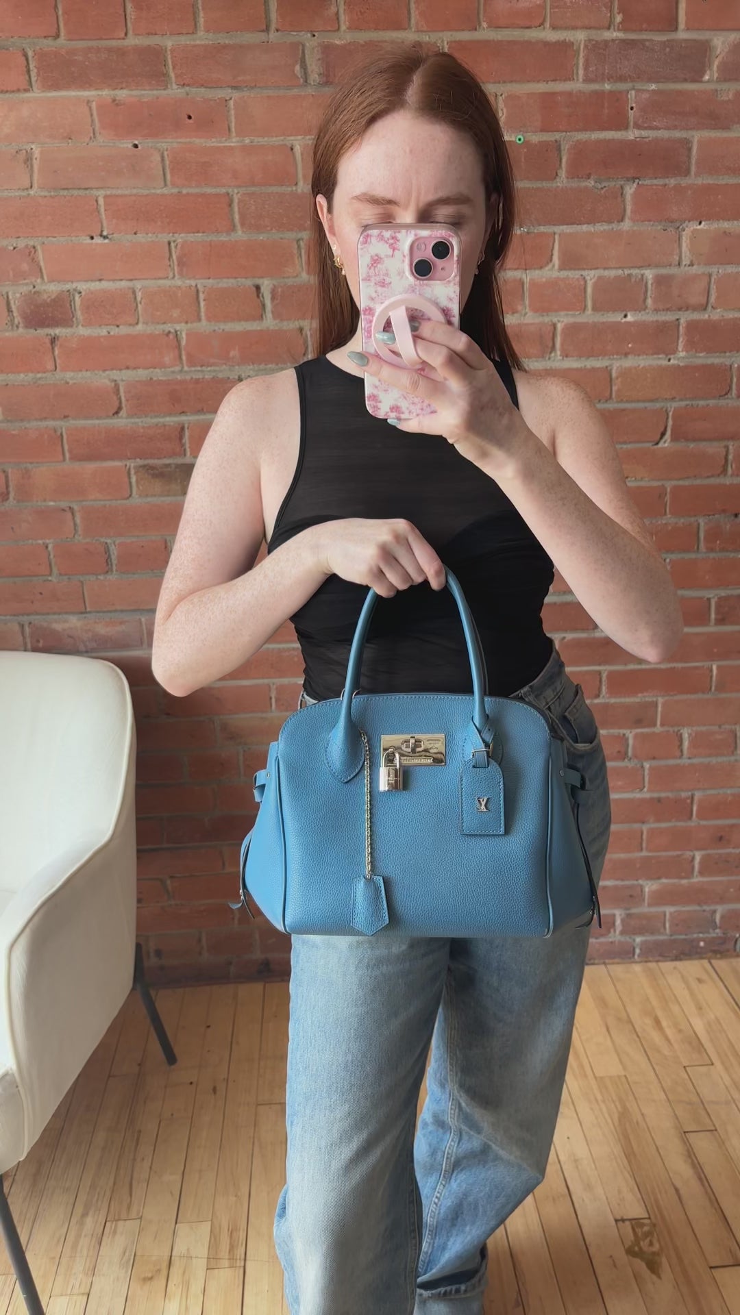 Louis Vuitton 'Milla PM' handbag in blue nuage leather with silver turnlock logo plaque and mini luggage tag on the front. The leather lined interior has a clip closure along with zip and slip pockets on the sides. The front twist lock opens a slip pocket that can be locked shut. Features decorative leather knots on the gussets and a a removable shoulder strap.