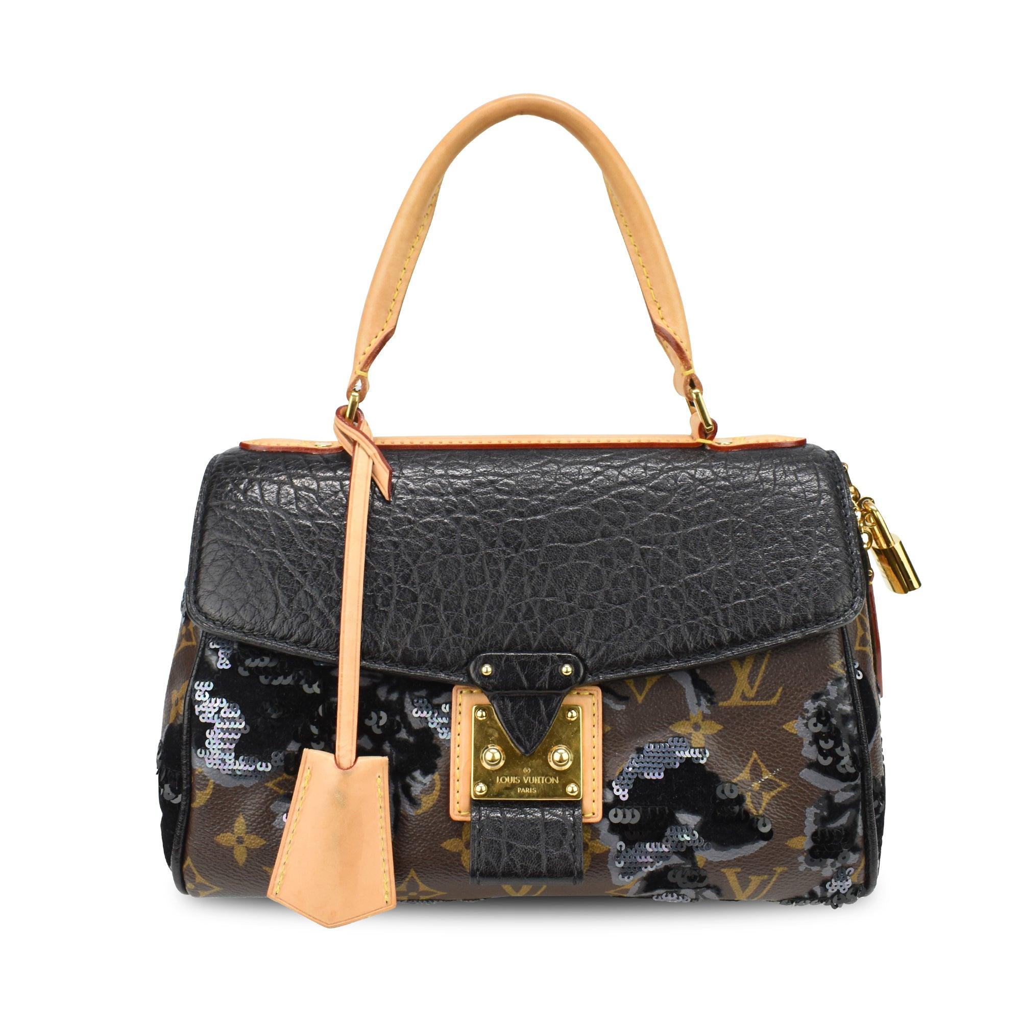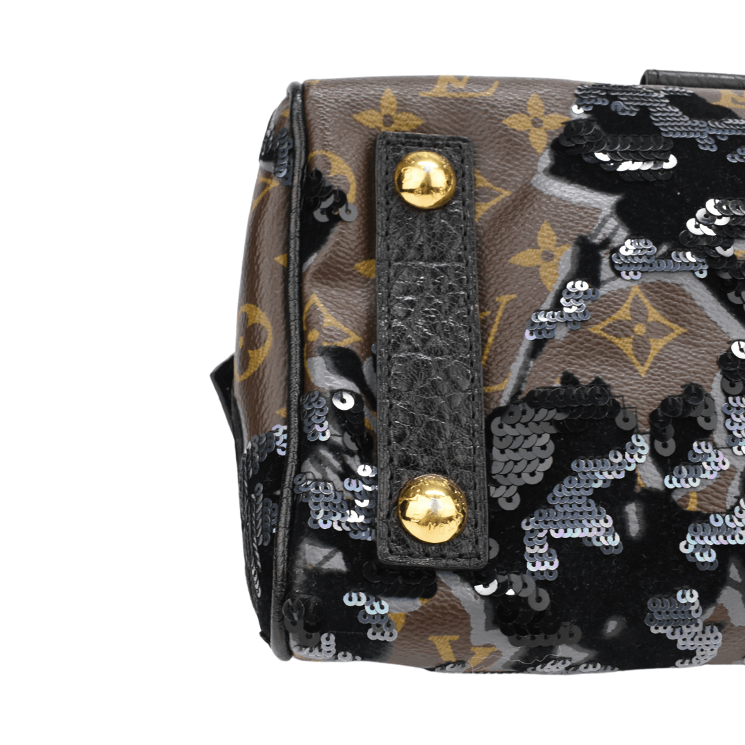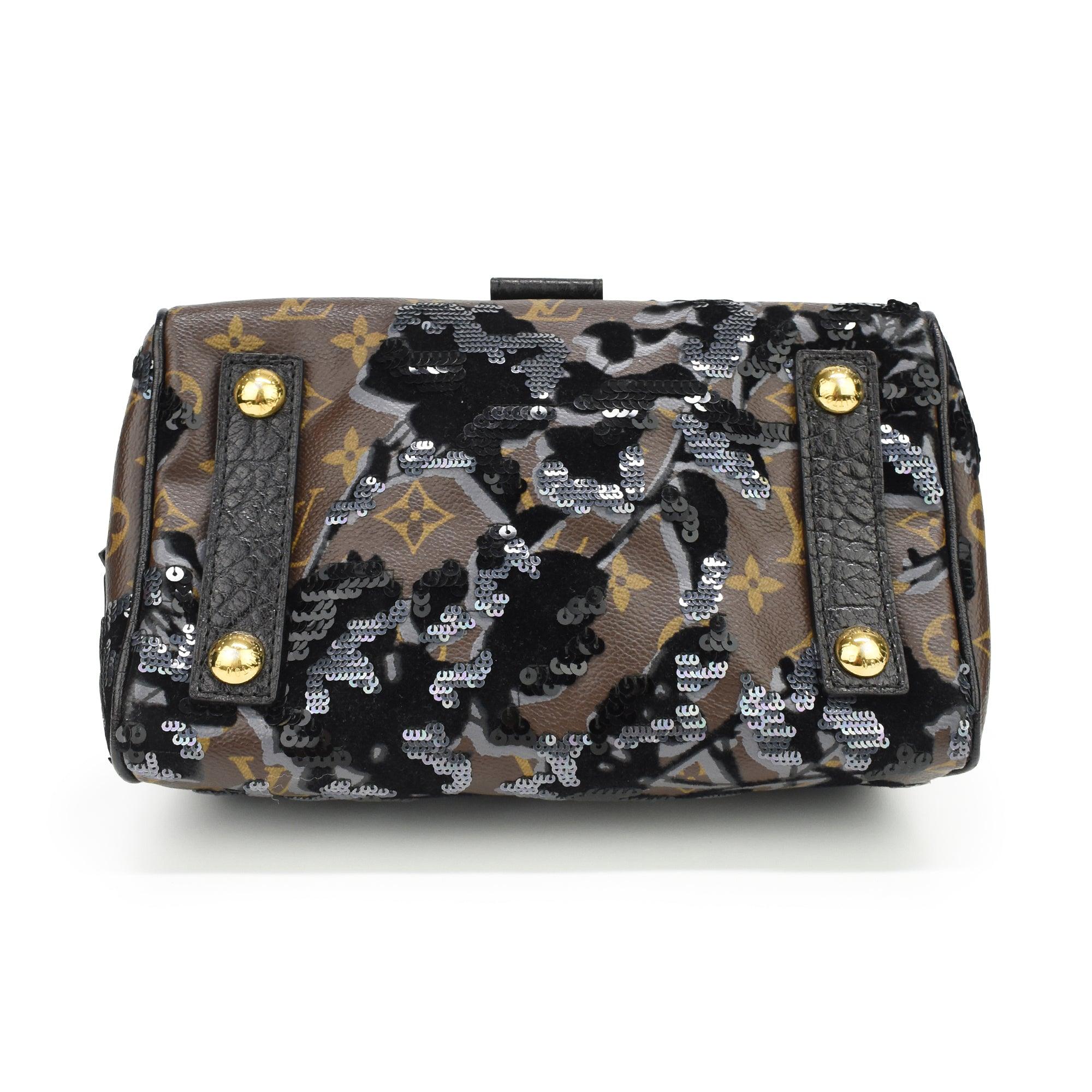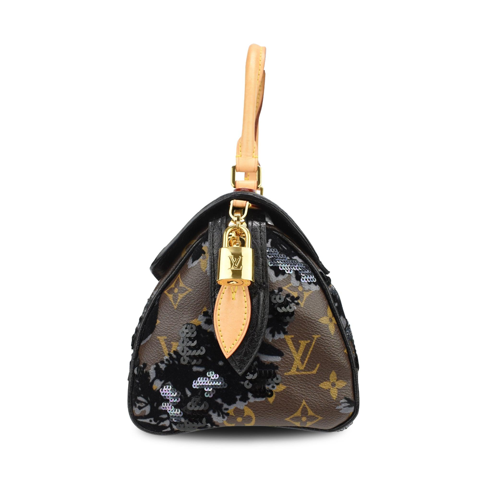 Louis Vuitton 'Fleur De Jai Carousel' bag in monogram coated canvas with grey silkscreen, black floral sequin, and velvet flocking throughout and a black textured leather front flap. Features a vachetta leather top handle, top trim and black piping. The bag has a both a top zip and lock closure in gold hardware and inner brown canvas lining with a slip pocket.