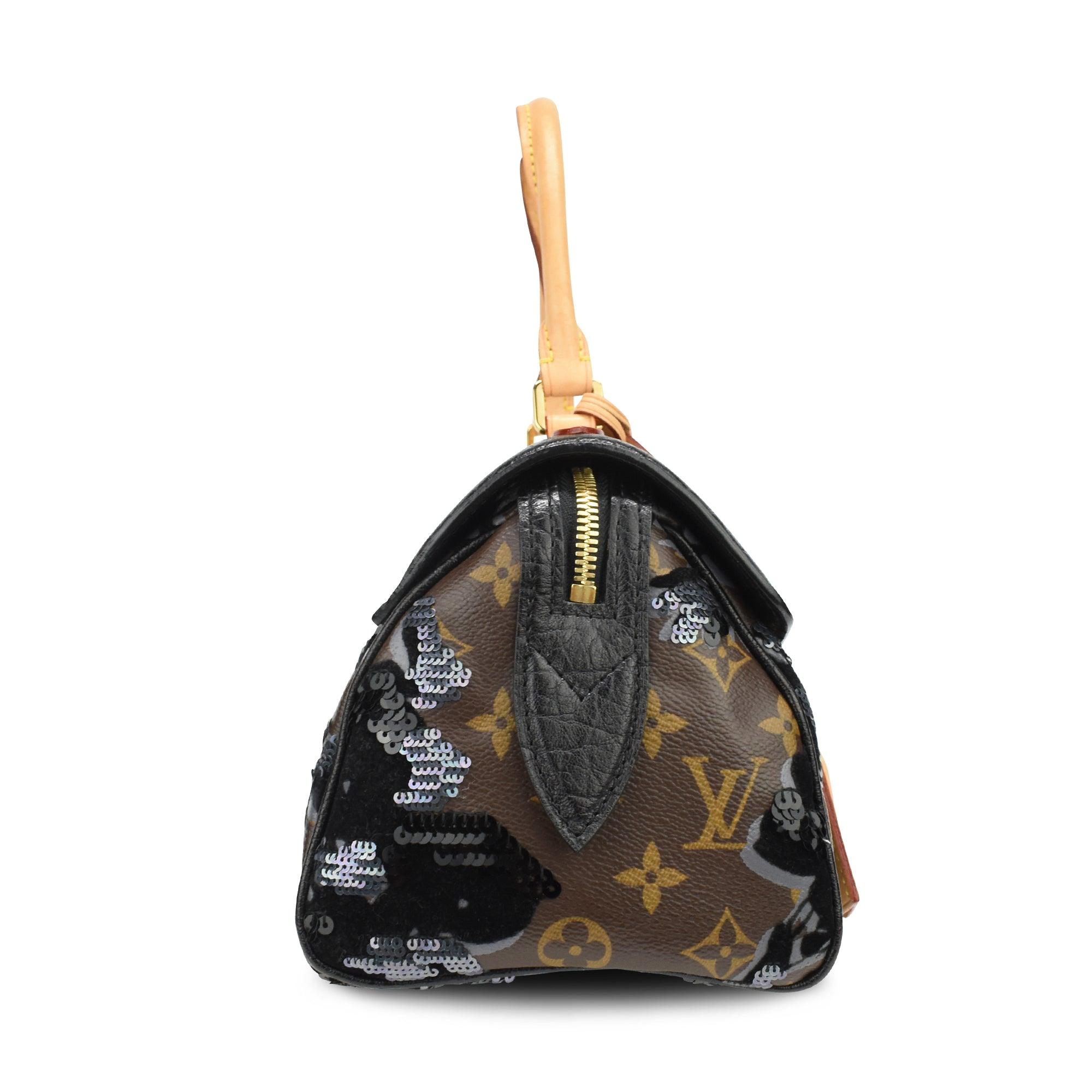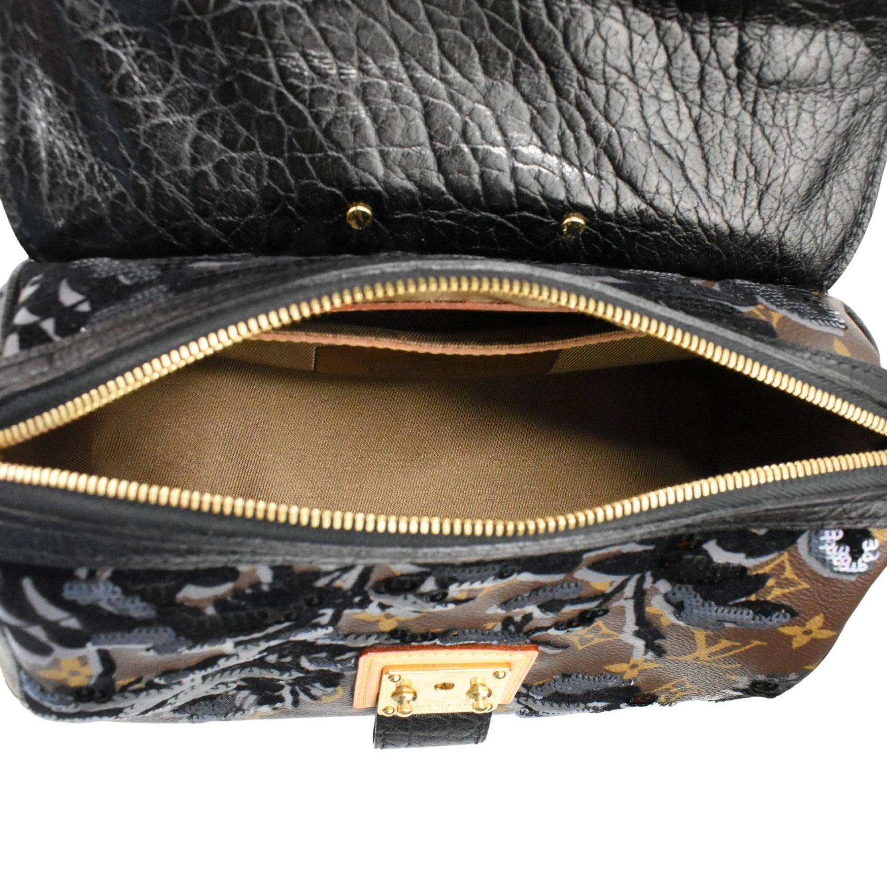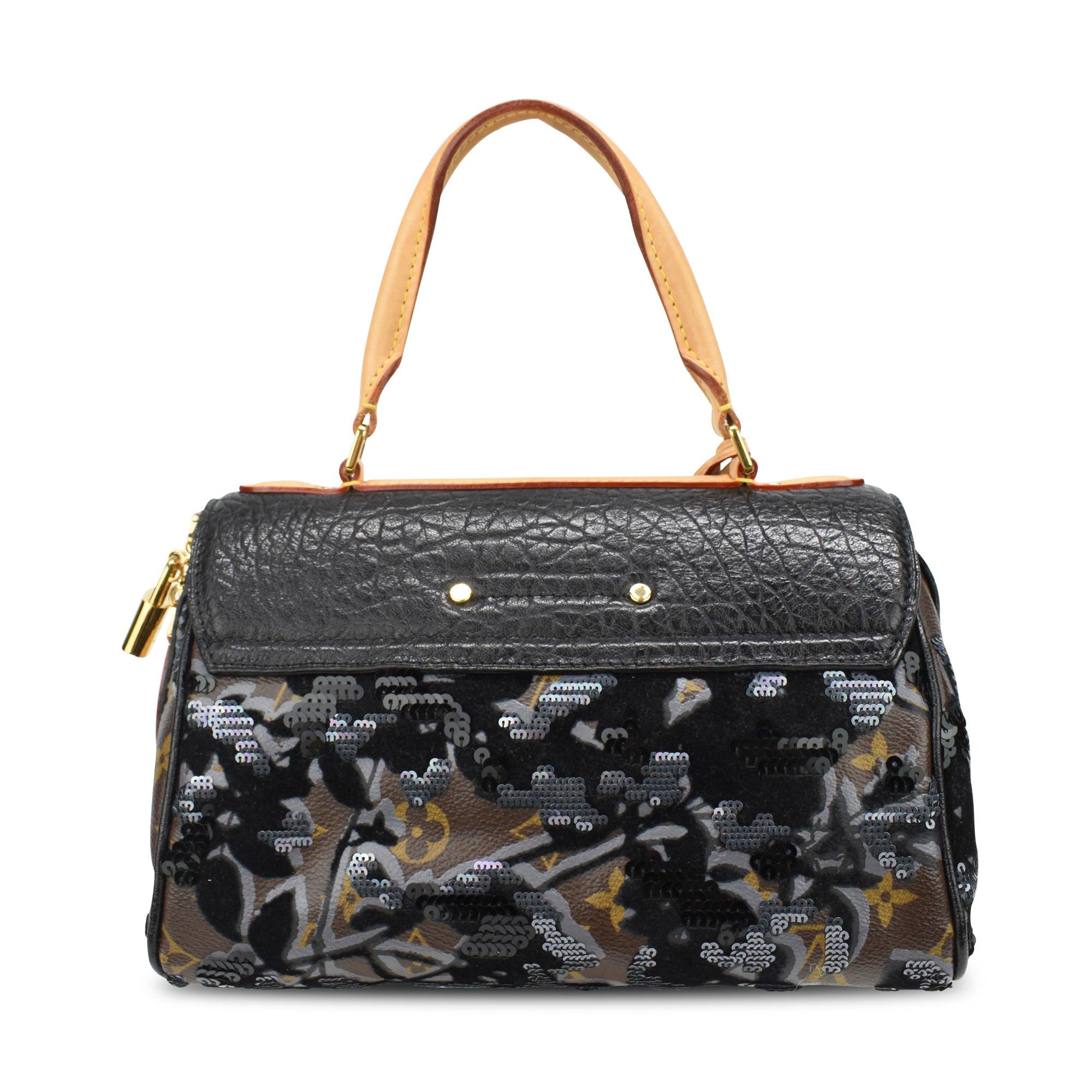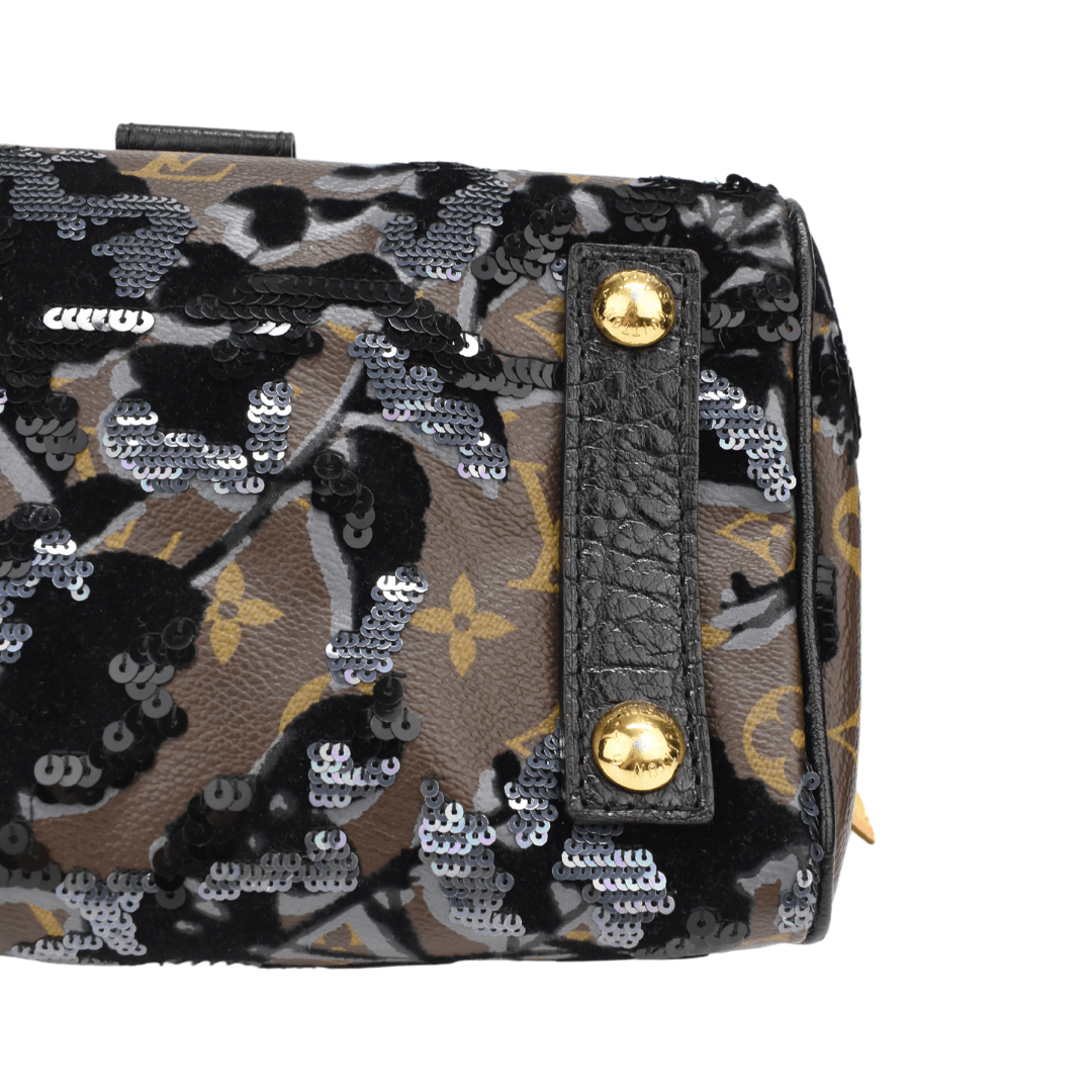 Louis Vuitton 'Fleur De Jai Carousel' bag in monogram coated canvas with grey silkscreen, black floral sequin, and velvet flocking throughout and a black textured leather front flap. Features a vachetta leather top handle, top trim and black piping. The bag has a both a top zip and lock closure in gold hardware and inner brown canvas lining with a slip pocket.