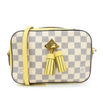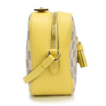 Louis Vuitton 'Saintonge' crossbody bag in damier azur coated canvas with yellow leather accents and gold hardware. Features a diamond shaped logo plaque with leather tassels on the front and a retractable flat top handle. The interior is lined with yellow canvas and has a single slip pocket.