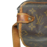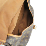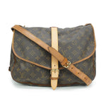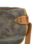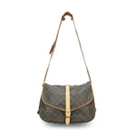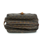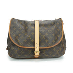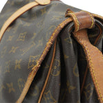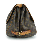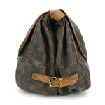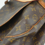 Louis Vuitton 'Saumur' double-sided messenger bag in brown monogram coated canvas. Features two sides with one divided into two compartments and the other with small slip-pockets, buckle strap closure on both sides, an adjustable crossbody strap, and small adjustable buckle straps on the sides. Circa 1992.