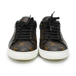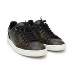 Louis Vuitton low-top sneakers in brown monogram coated canvas with black leather trim detailing, gold eyelet hardware, gold logo hardware on the heels, and black flat laces.