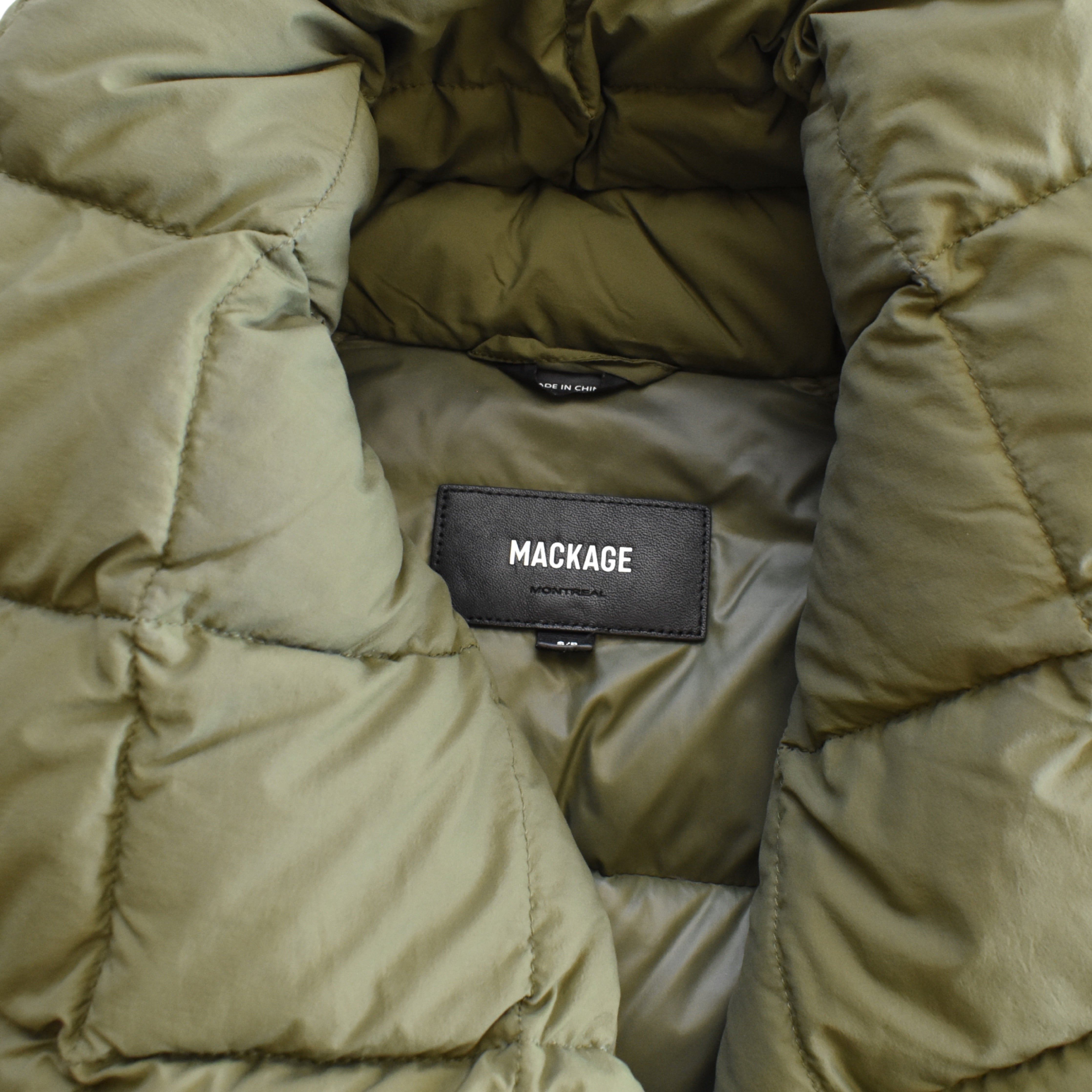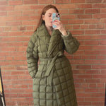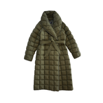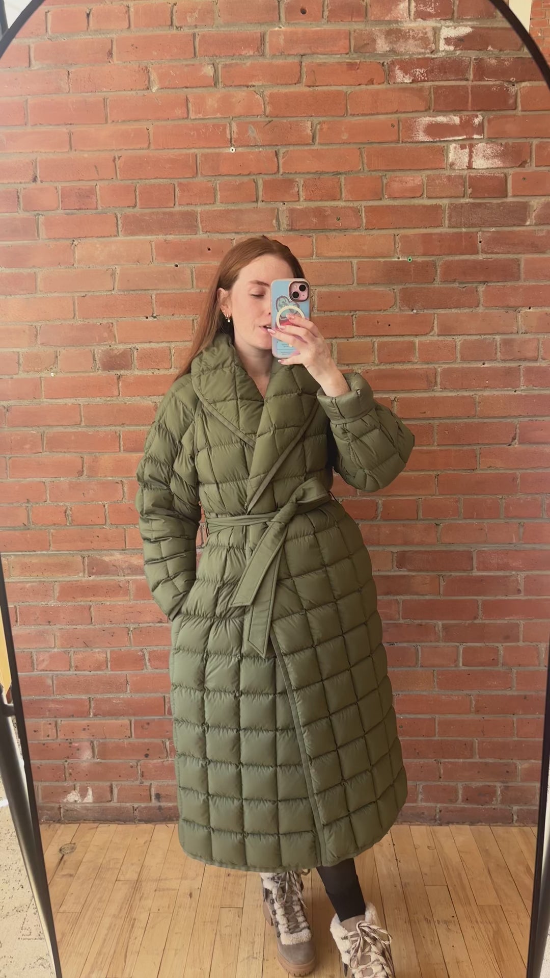 Mackage 'Allegra' mid-length, down-filled wrap coat in olive green quilted nylon with hidden snap buttons and a matching belt. Features logo embroidery on the left sleeve, a shawl collar, and zip pockets at the hips.