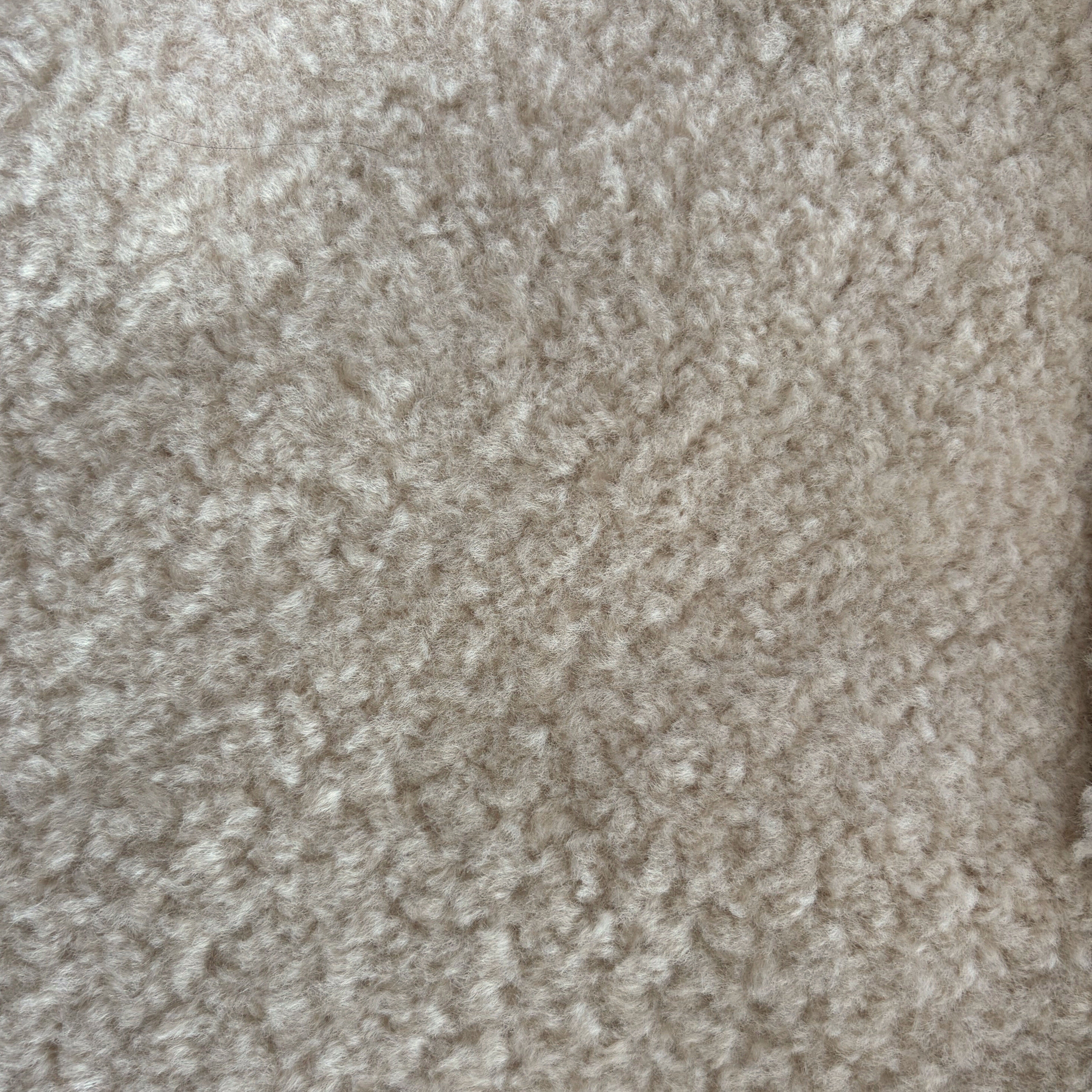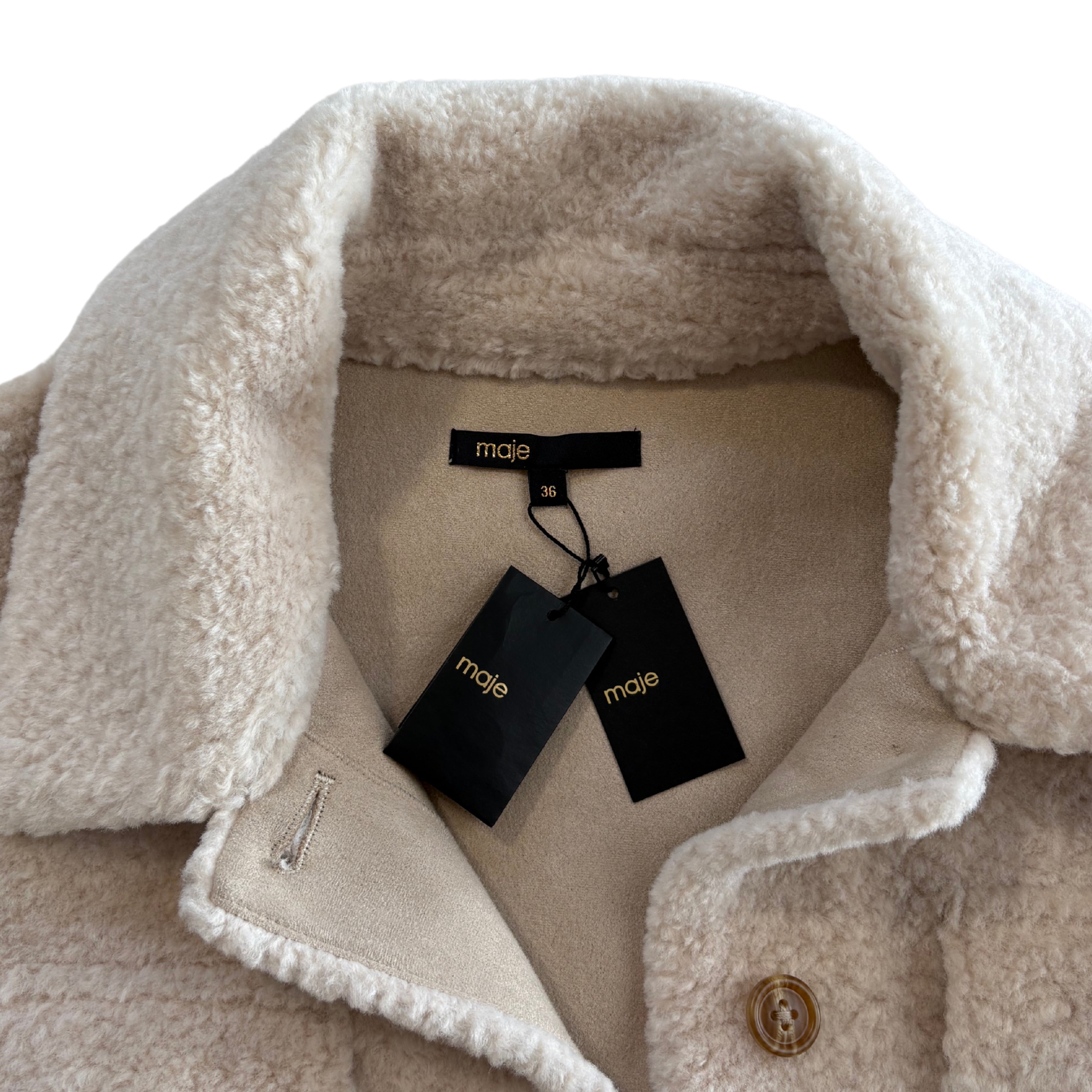 Maje shacket in cream faux shearling with tortoiseshell buttons and flap pockets on the chest.