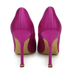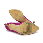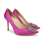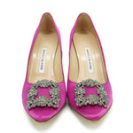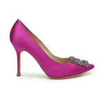 Manolo Blahnik 'Hangisi' pumps in magenta satin with a pointed toe and a crystal broach with gunmetal hardware.