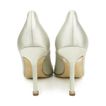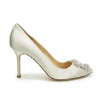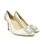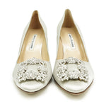 Manolo Blahnik 'Hangisi' pumps in light grey satin with signature square crystal in silver rhinestone.