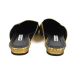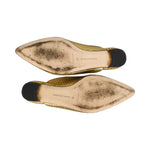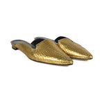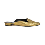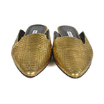 Manolo Blahnik flat mules in metallic gold snakeskin with a black sole and a pointed toe.