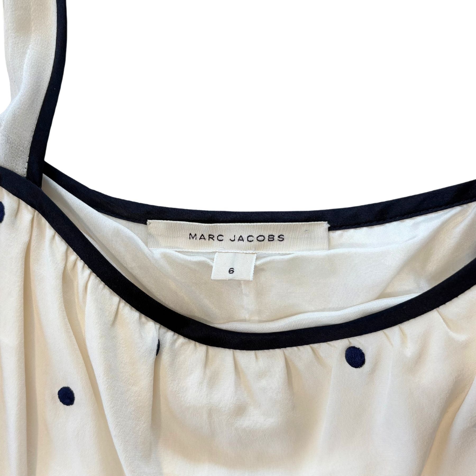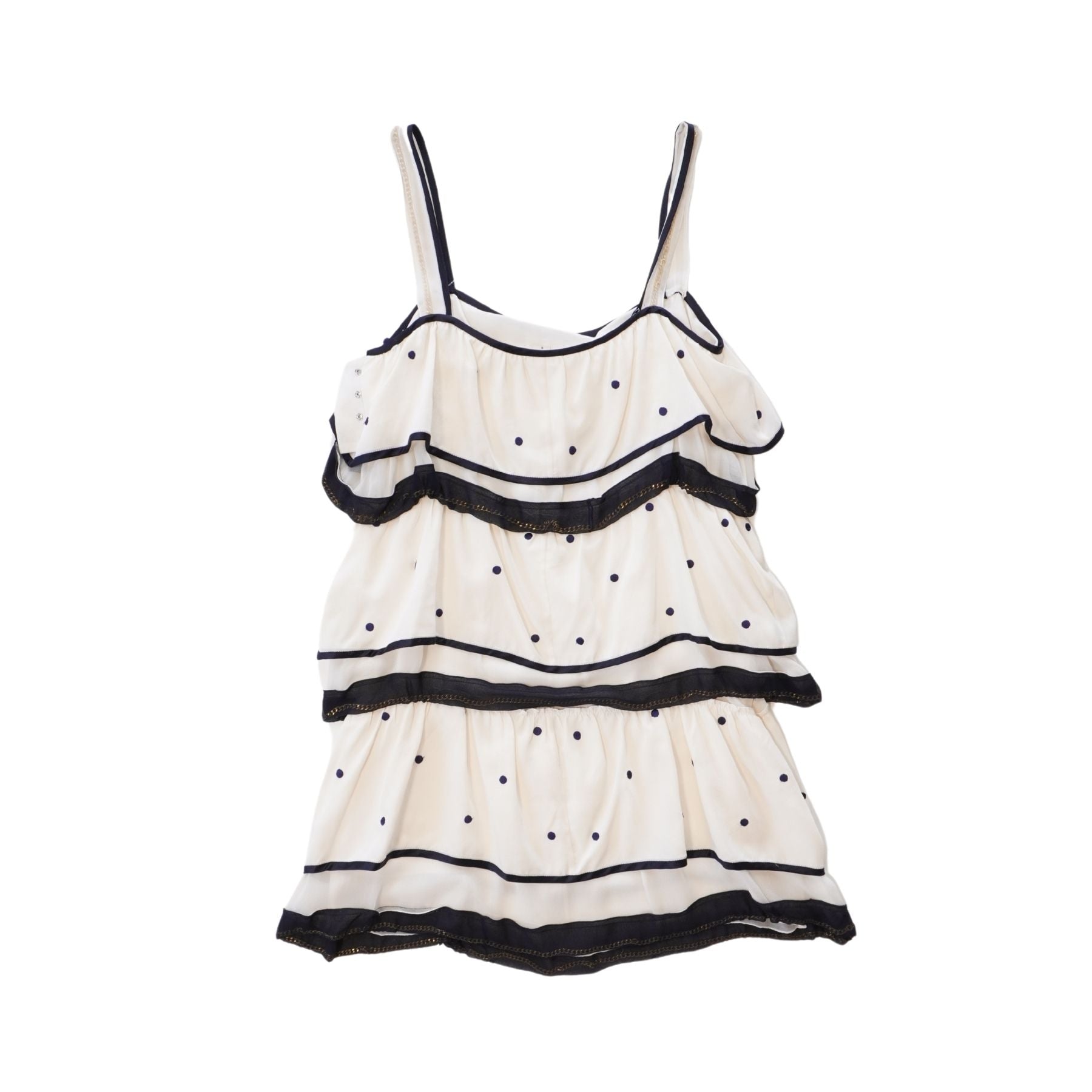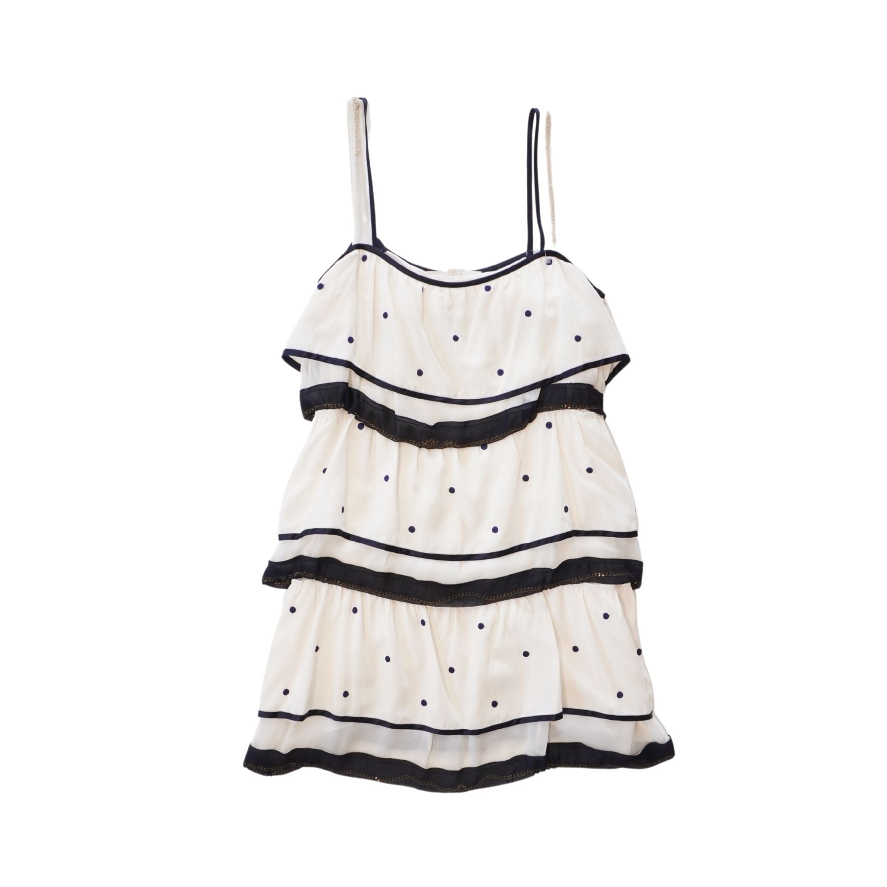 Marc Jacobs tiered ruffle mini dress in white silk with embroidered navy polka dots., navy ribbon trim, and gold chain link detail within the trim.