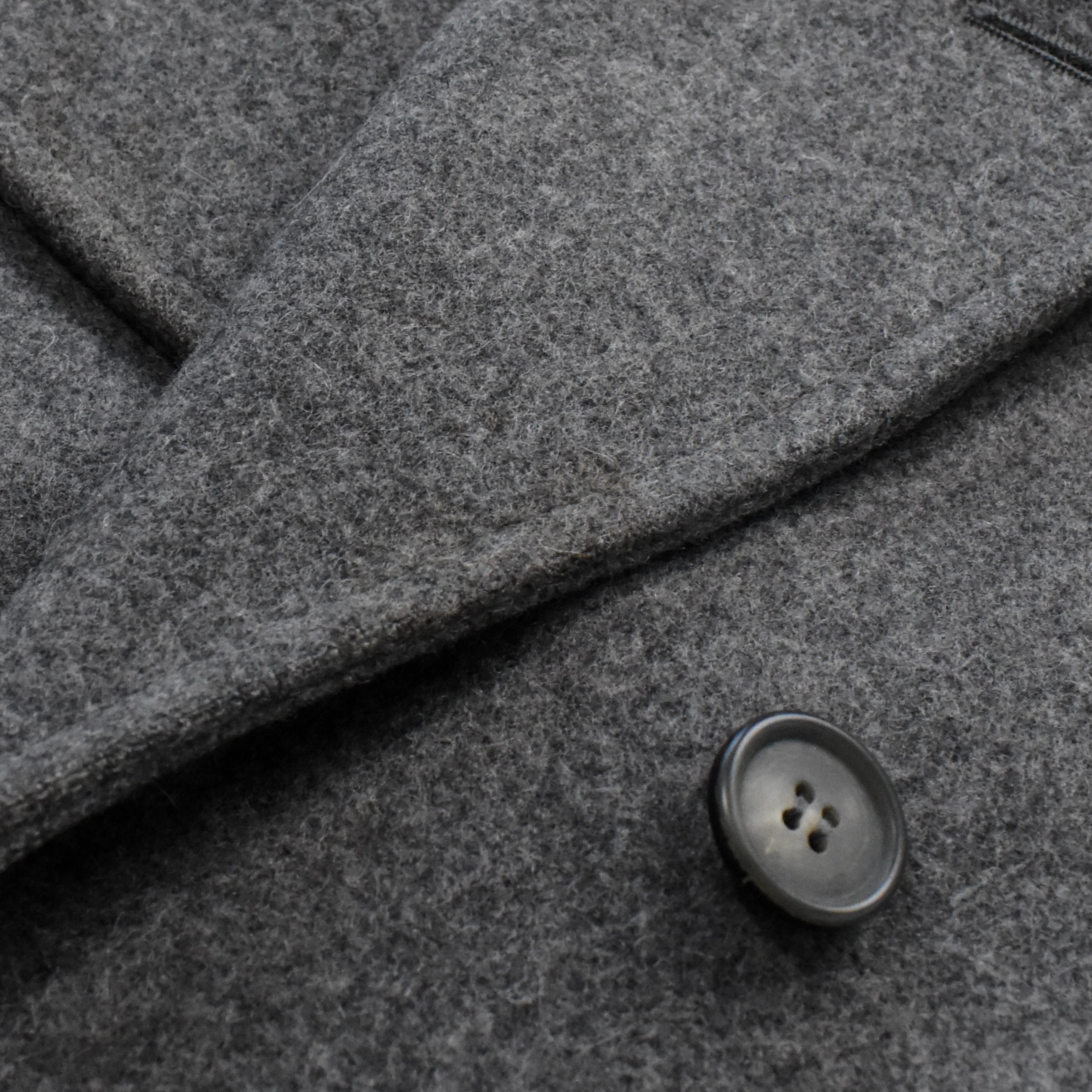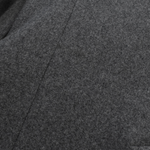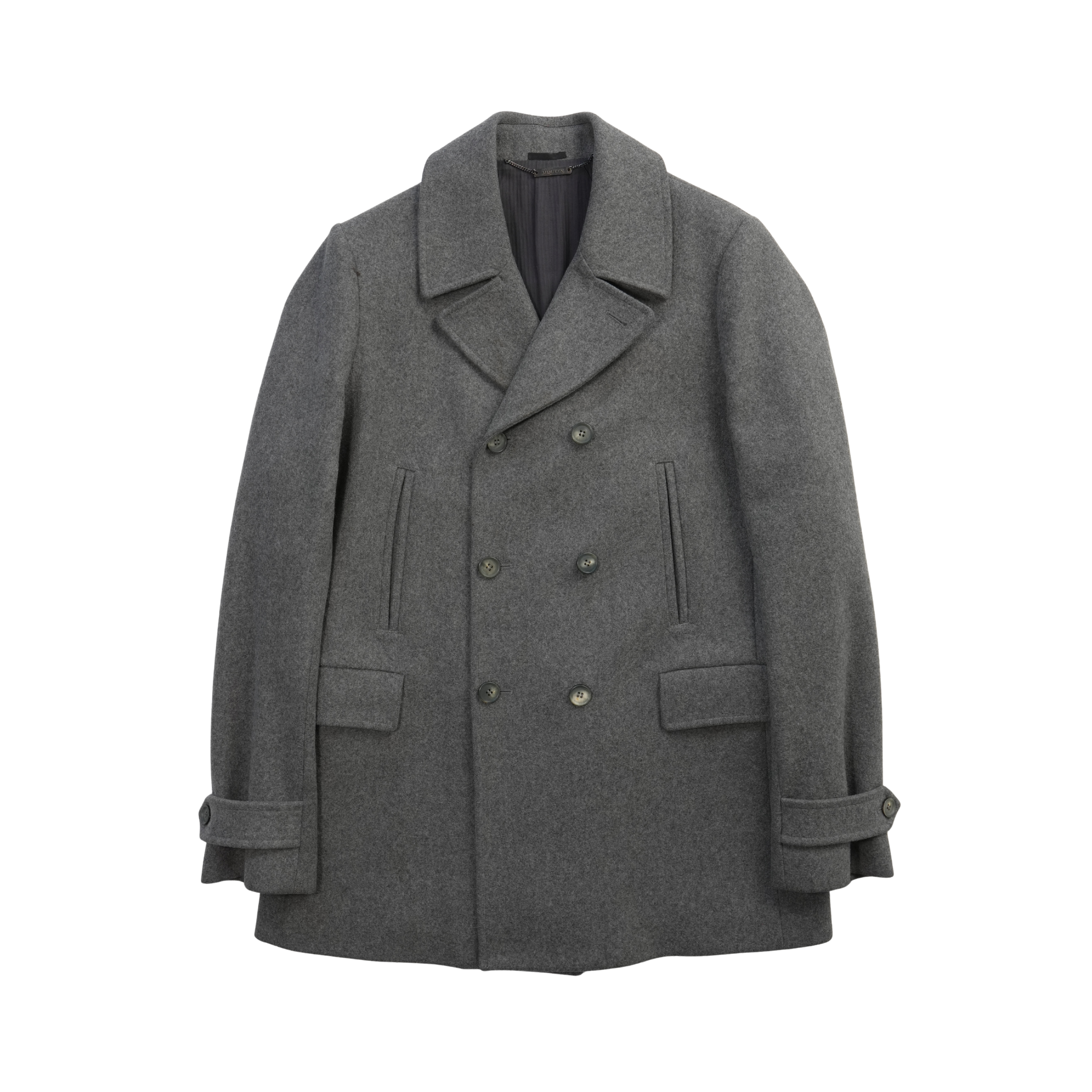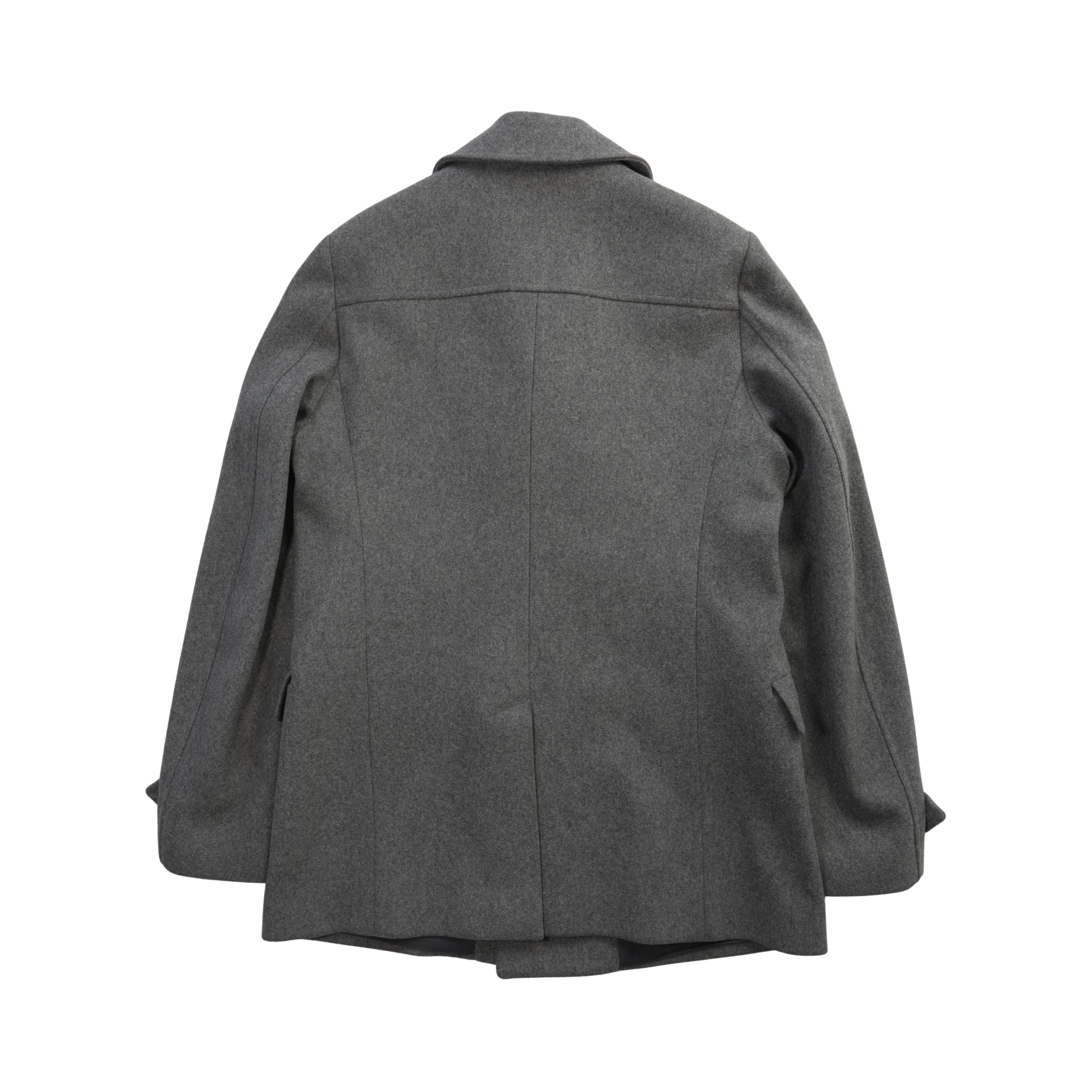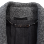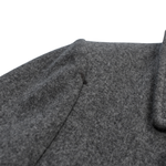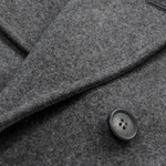 Alexander McQueen double-breasted coat in grey wool with tortoise buttons, flap pockets, and a notch lapel collar.