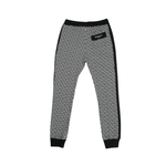 Balmain track pants in a black and white monogram print with black side panels and a ribbed hem. Features a drawstring at the waist and a logo on the back pockets.