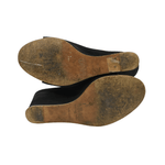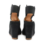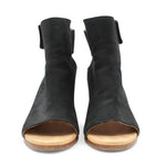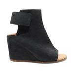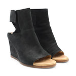 MM6 wedge heels in black leather with a velcro ankle strap, a cut out heel, and a peep toe detail.