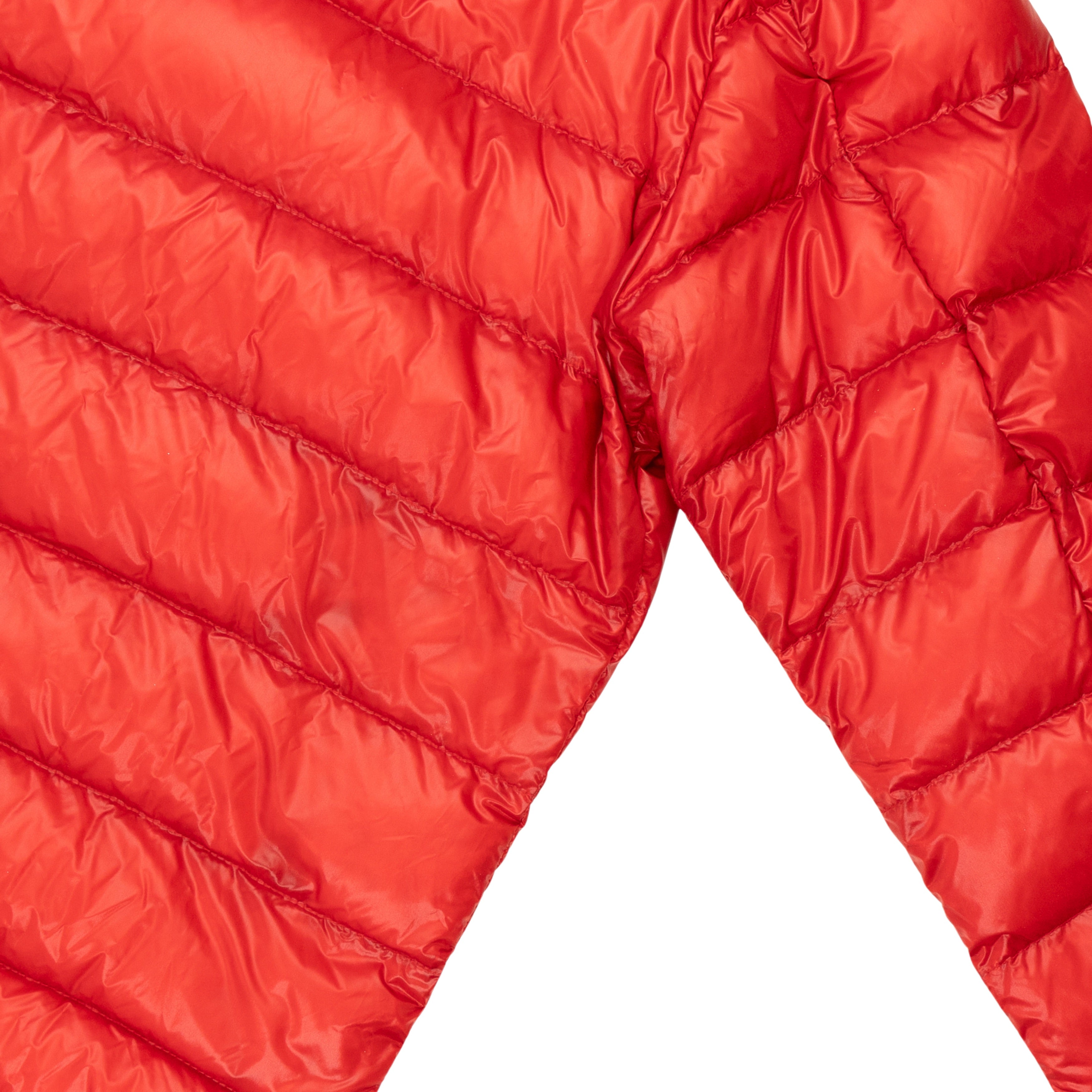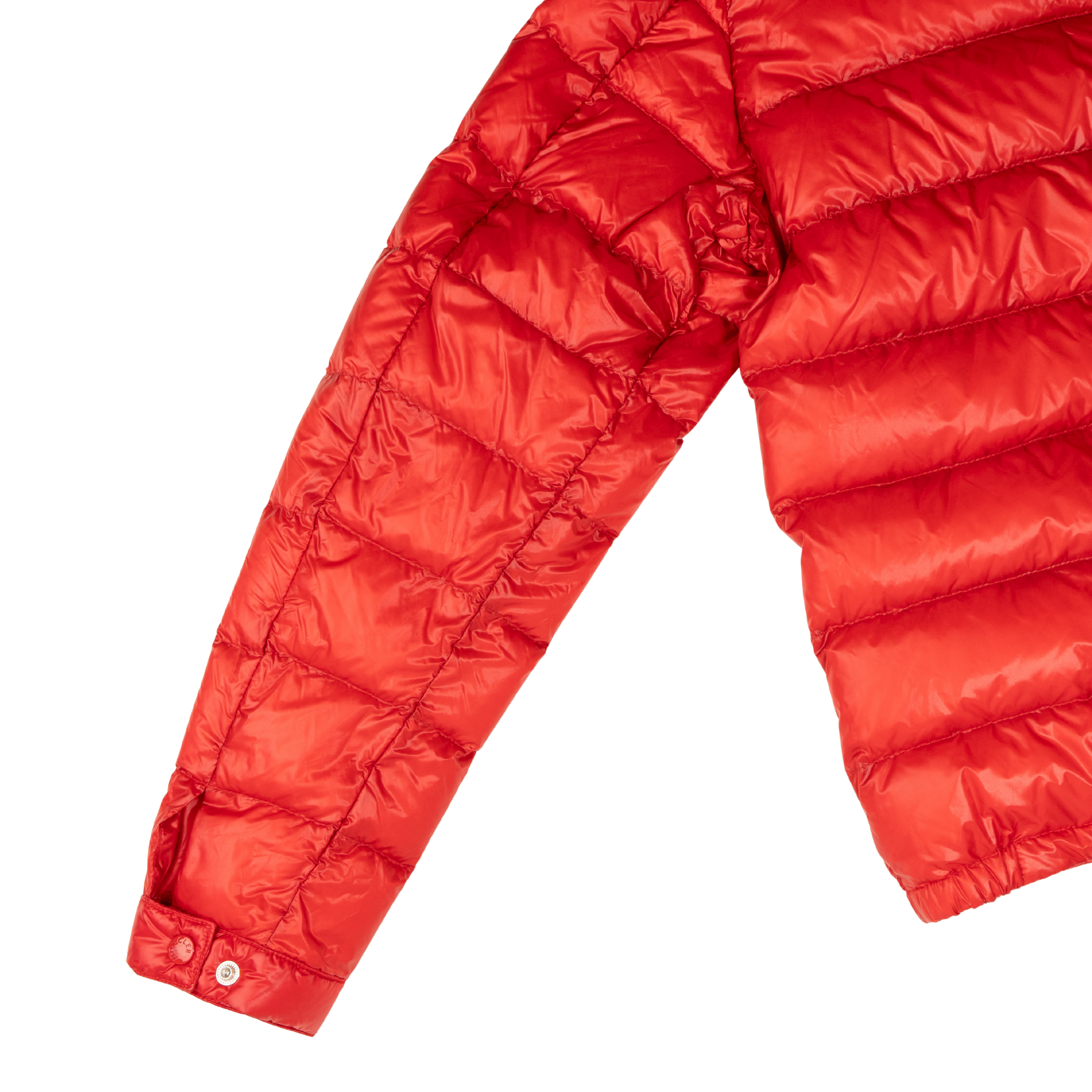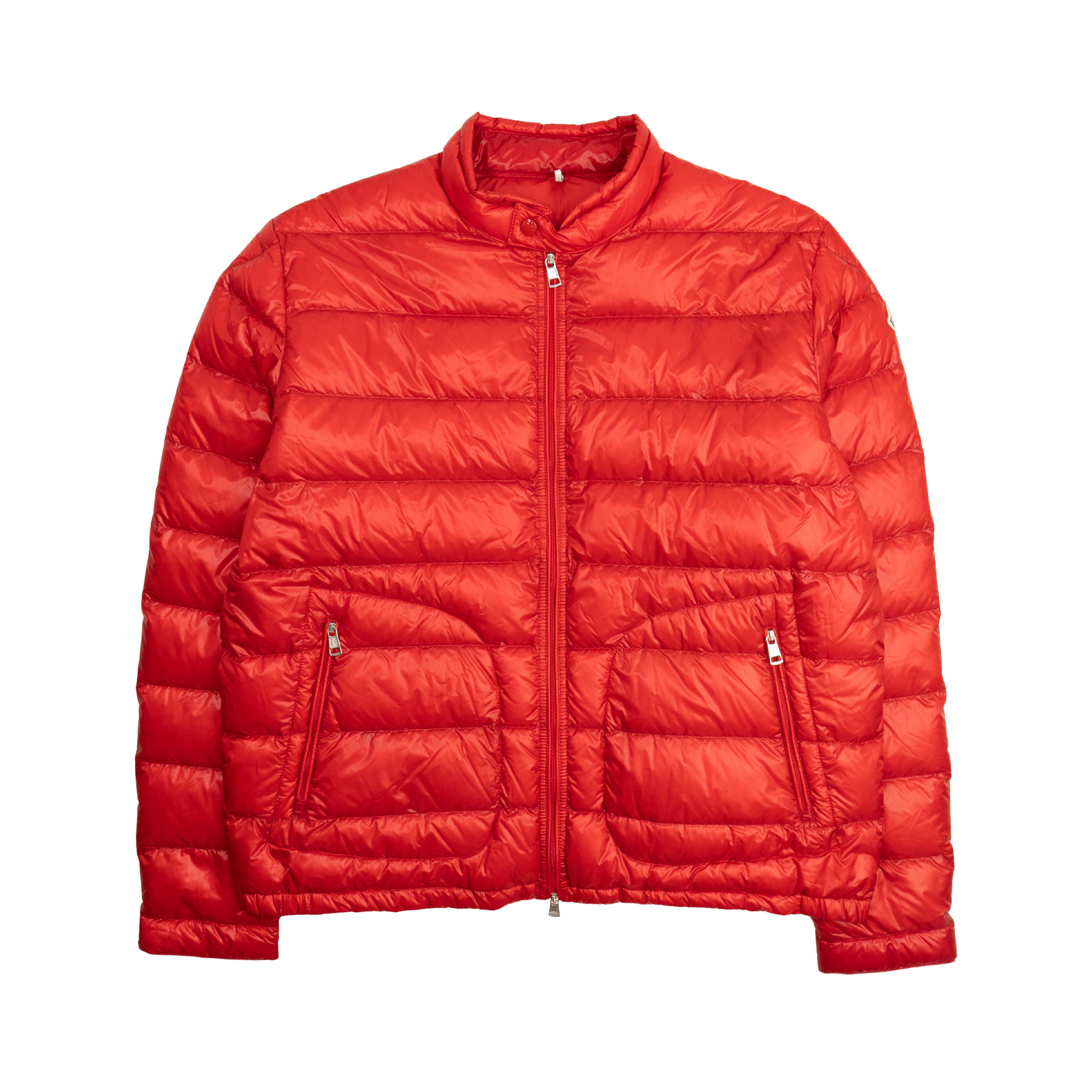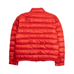 Moncler 'Acorus' short lightweight down jacket in red nylon with two front zip pockets, two way zipper and short stand collar. Featuring a packable pouch.