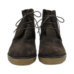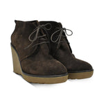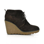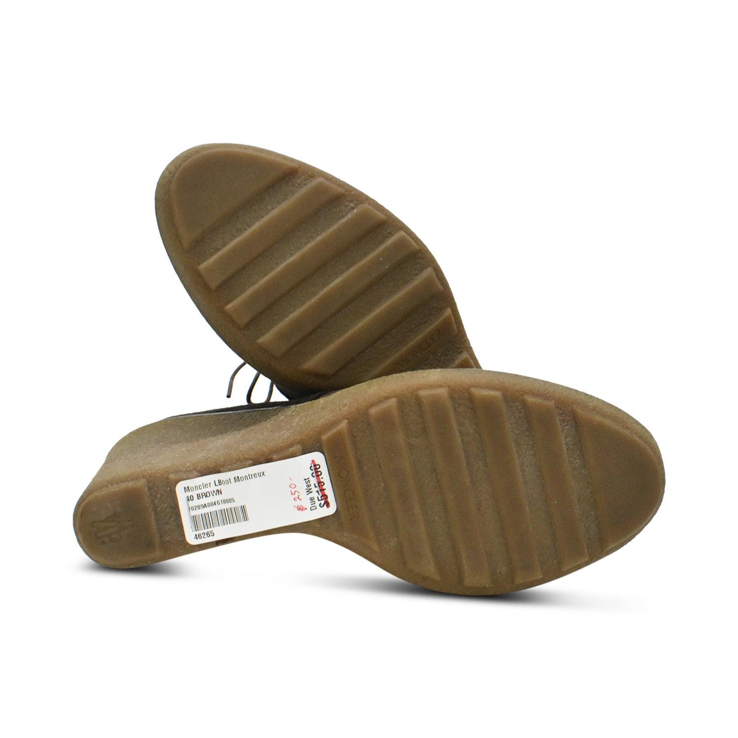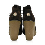 Moncler Boots in brown suede with a wedge heel and gum sole. Features a lace up closure. Includes box.