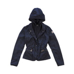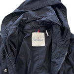 Moncler 'Effisia' windbreaker jacket in navy nylon with a front zip and snap opening, zip pockets, and a packable hood.