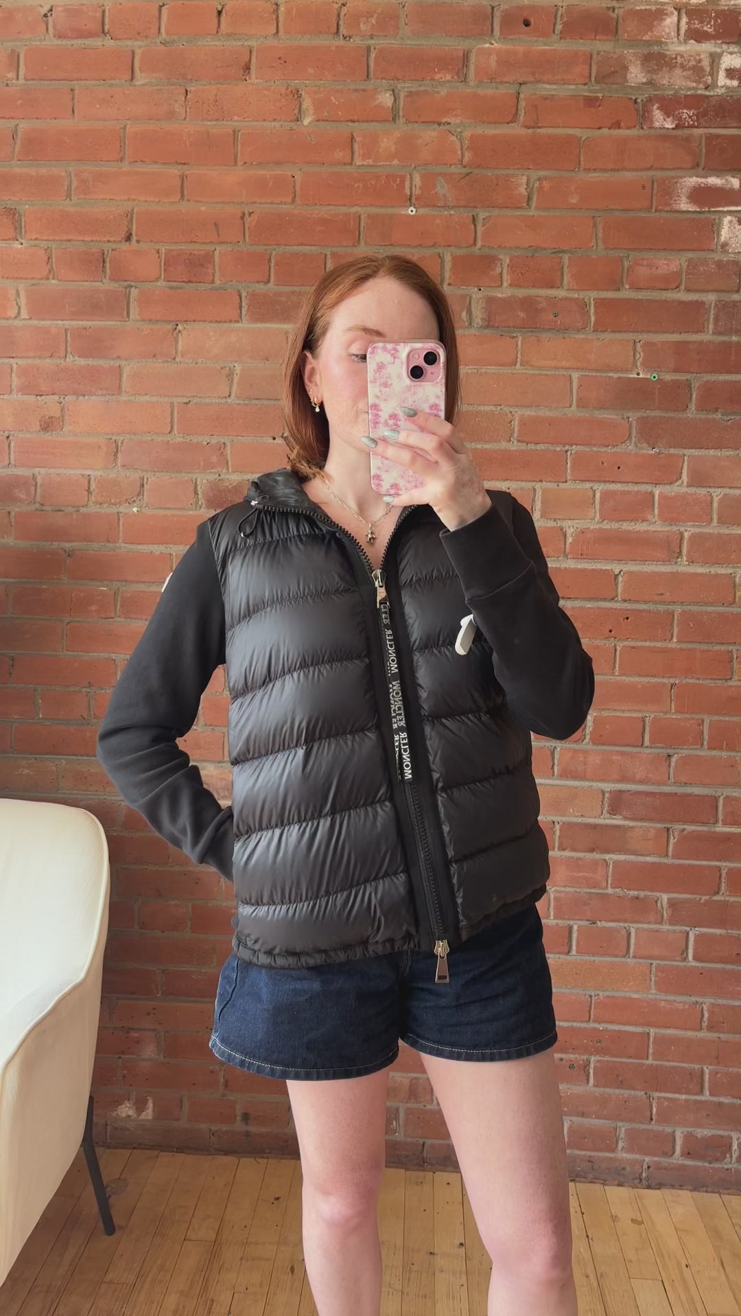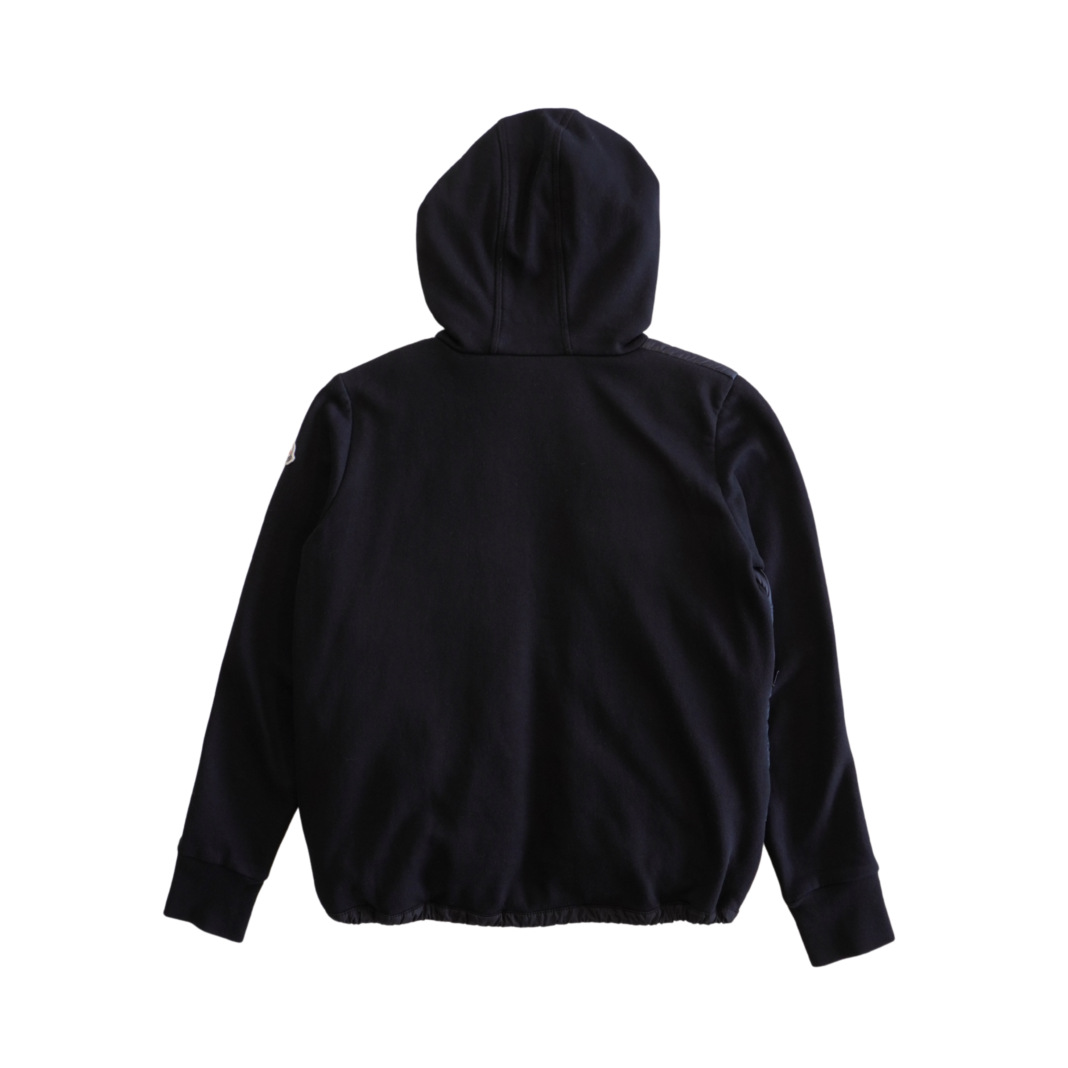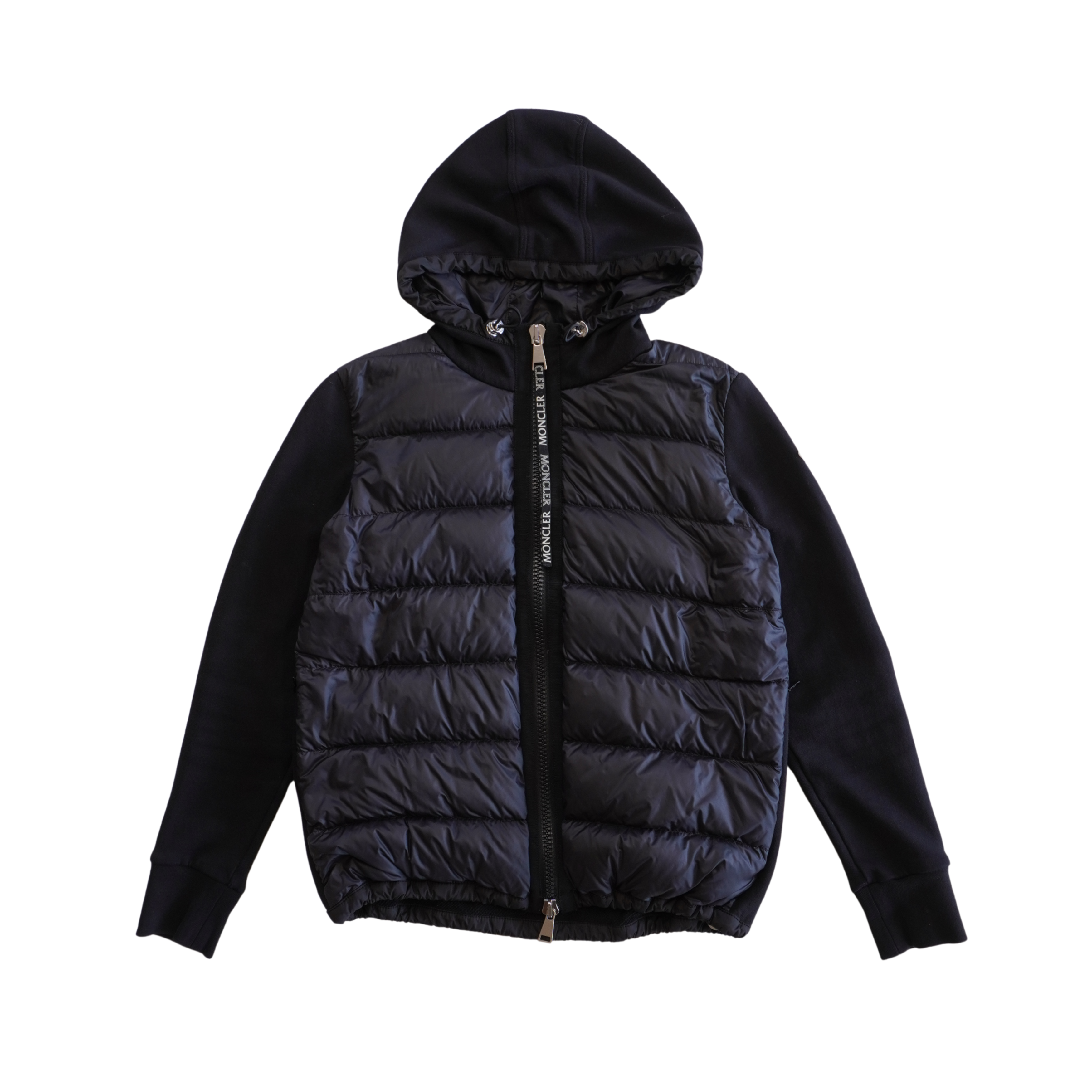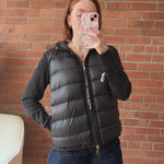 Moncler 'Hooded Maglia Cardigan'  jacket in black cotton jersey with quilted down-filled front panel. Features a two-way zipper with elongated logo zipper pull and elasticized drawstring hem.