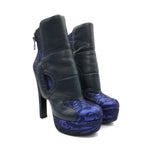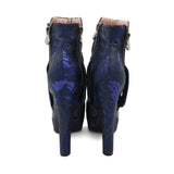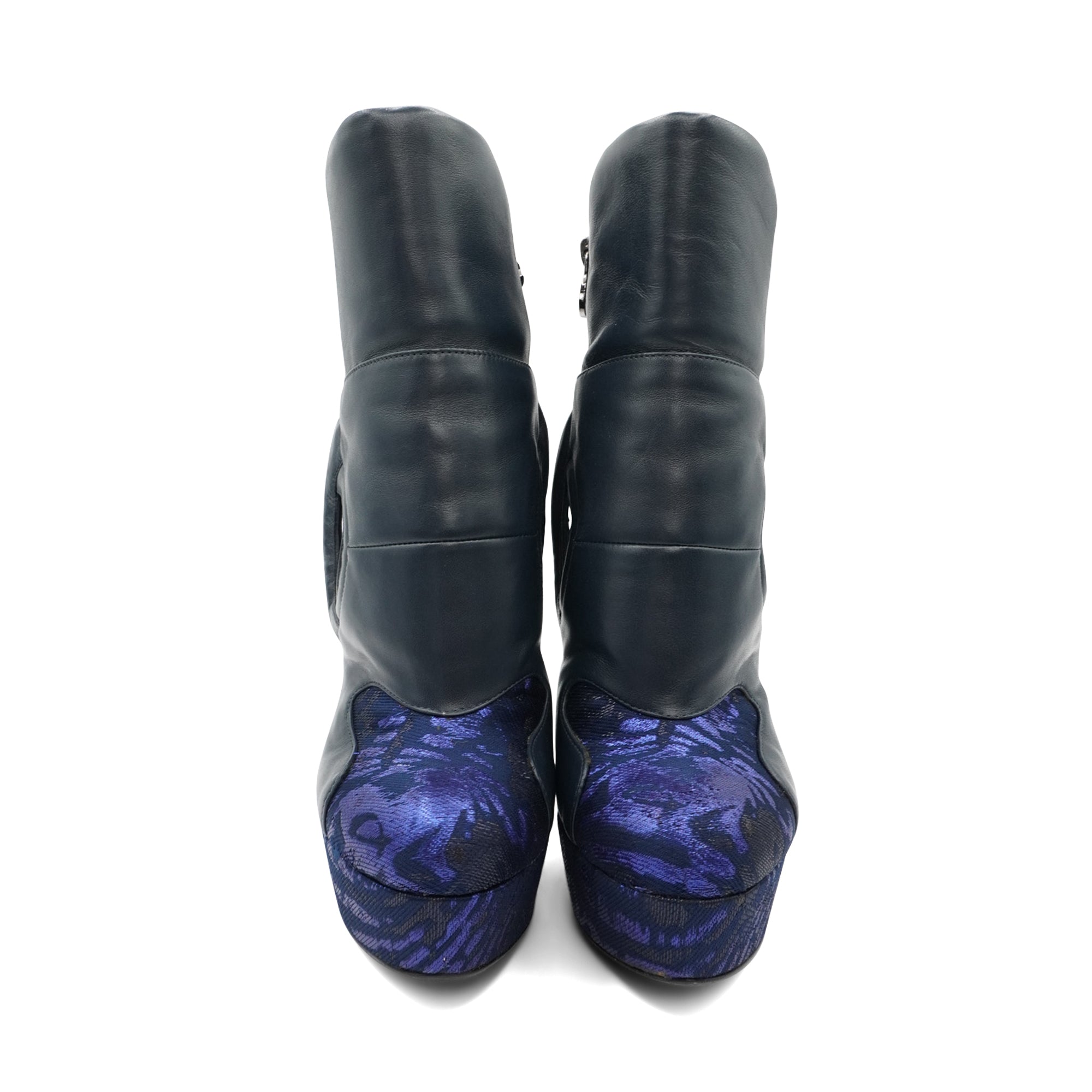 Moncler platform boots in a metallic blue textured jacquard with navy leather panelling, double side zip openings in silver hardware, a high heel, and a platform sole.
