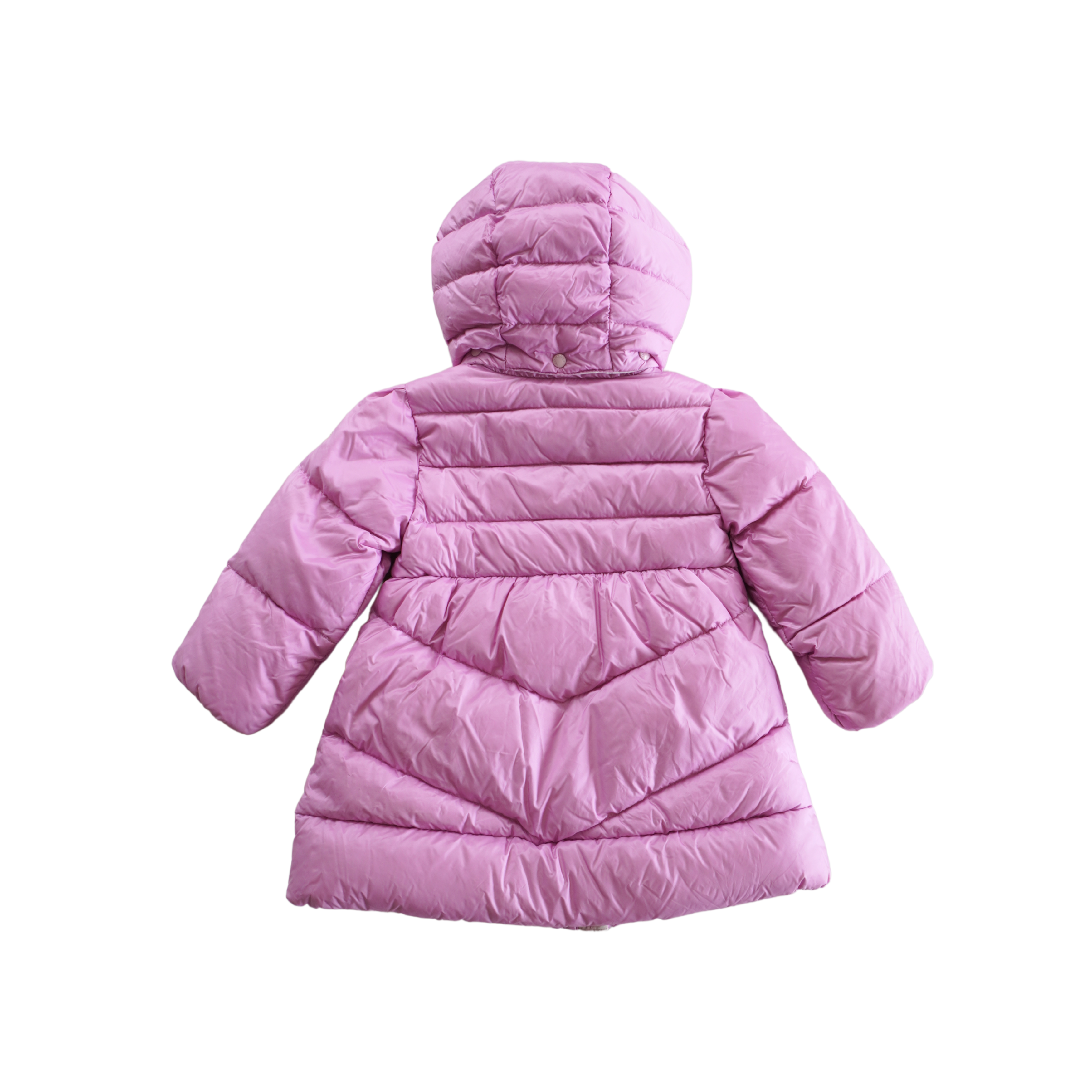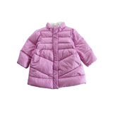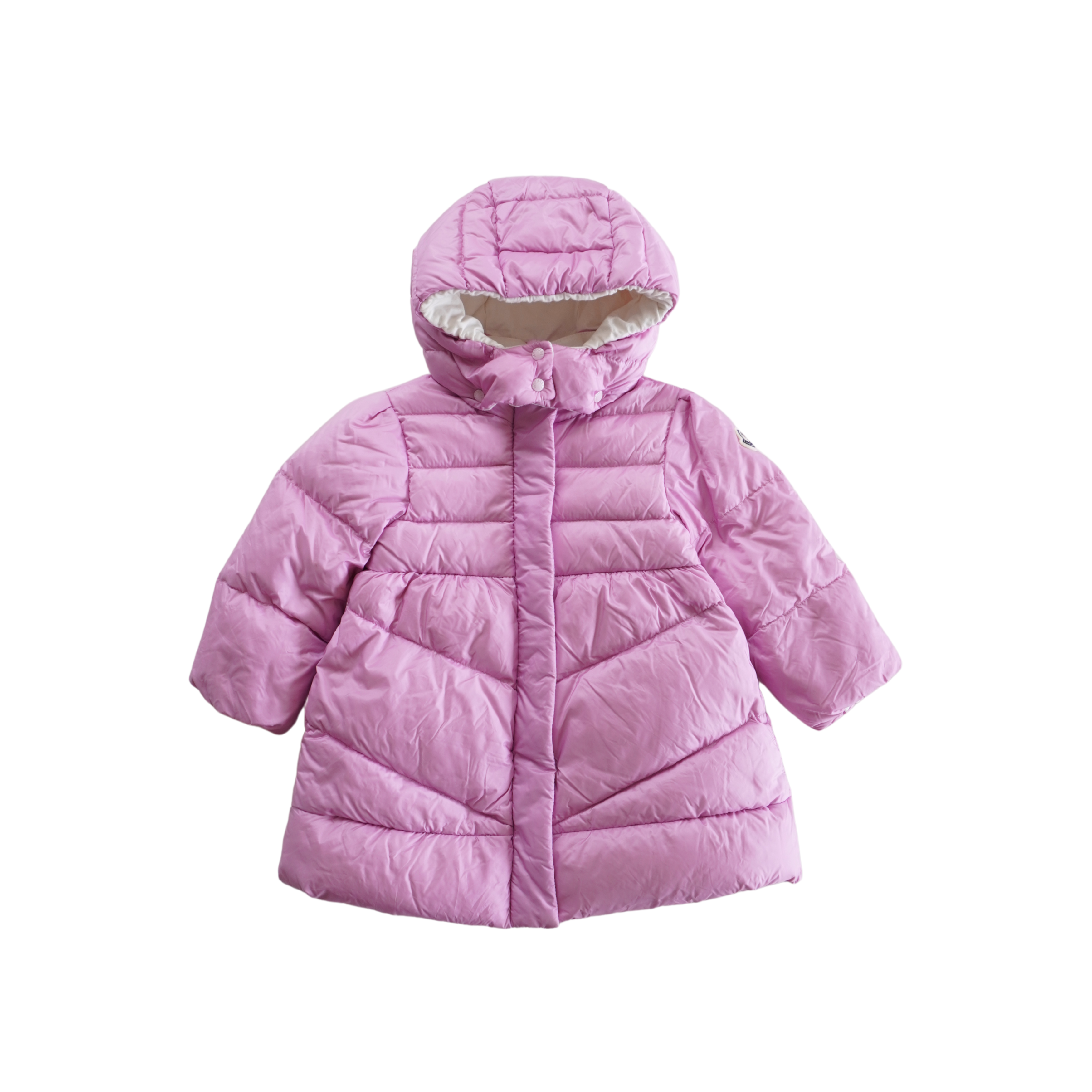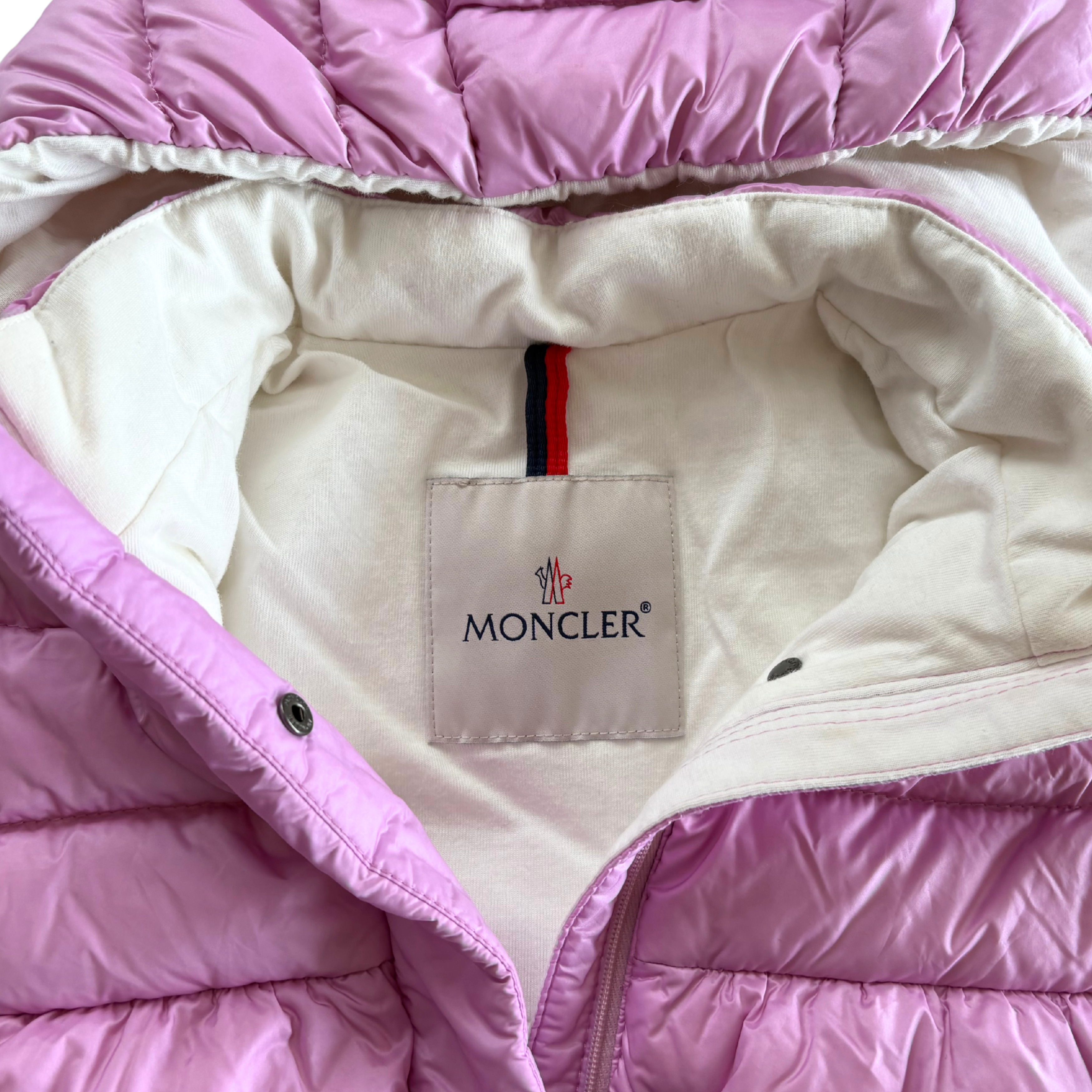 Moncler children's puffer jacket in light orchid purple nylon with a shoulder patch, removable hood, and cinched cuffs. Features zipper and snap button closure, a white cotton lining and an empire waistline.