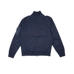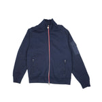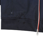 Moncler sweater in a navy cotton blend with a front-zip opening in silver hardware, a navy, red and white stripe down the centre, and a snap pocket on the sleeve with a signature logo patch.
