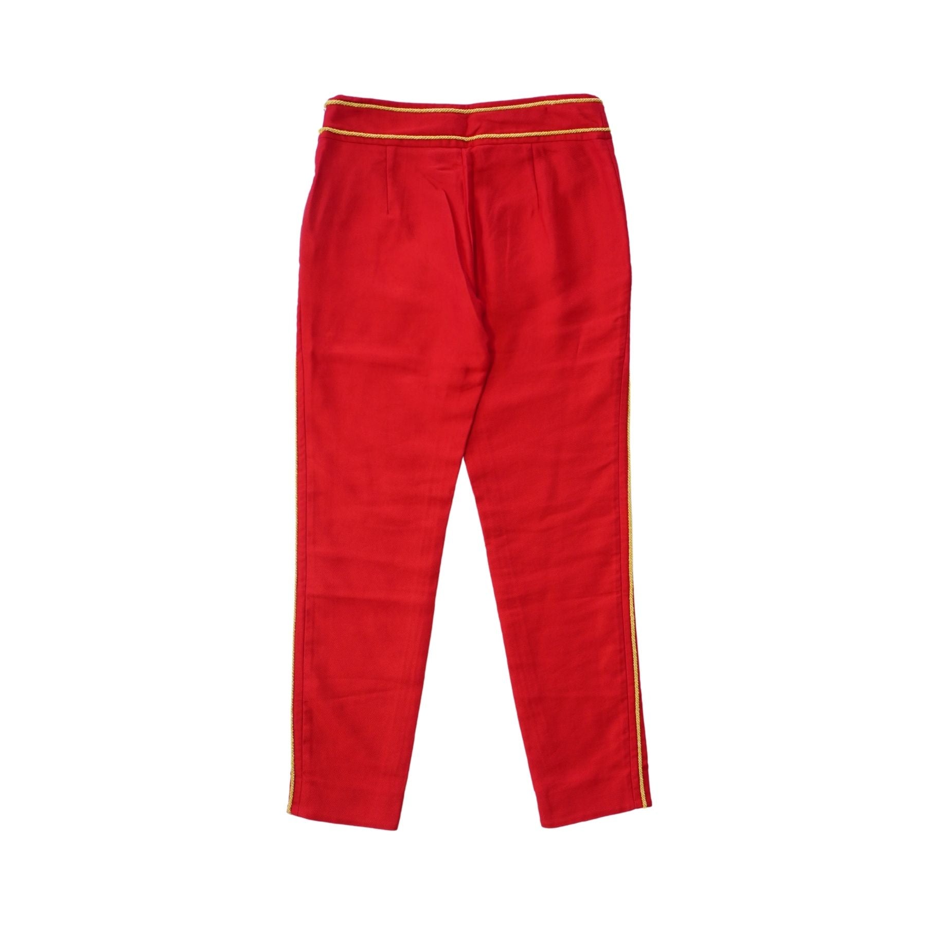 Moschino Couture! straight leg band pants in a red cotton blend with a gold rope trim and a tapered fit.
