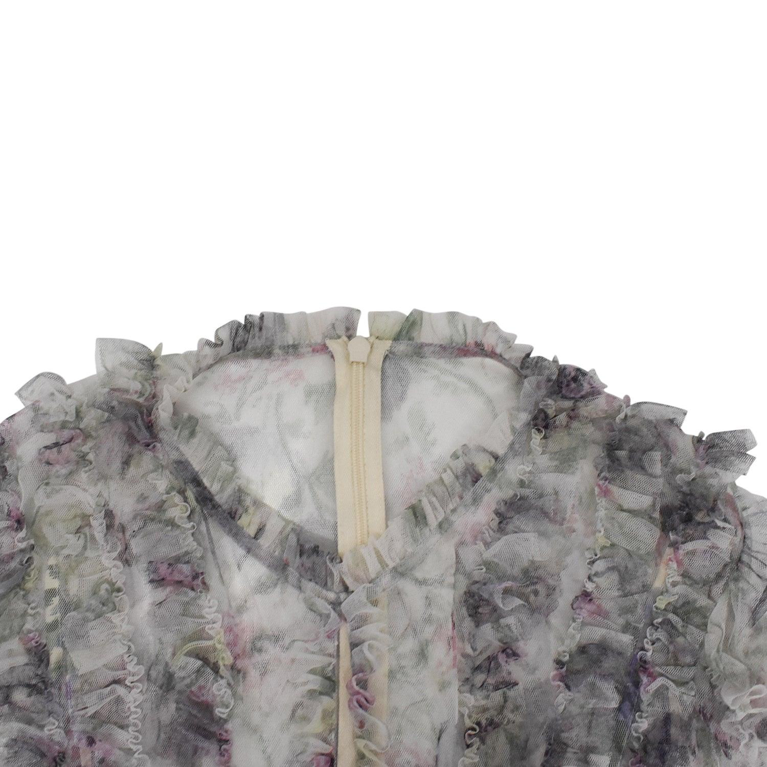 Needle & Thread dress in white, purple, and green sheer mesh fabric with cream canvas detail. The dress has a floral patterned lining, zipper closure, and belt detail.