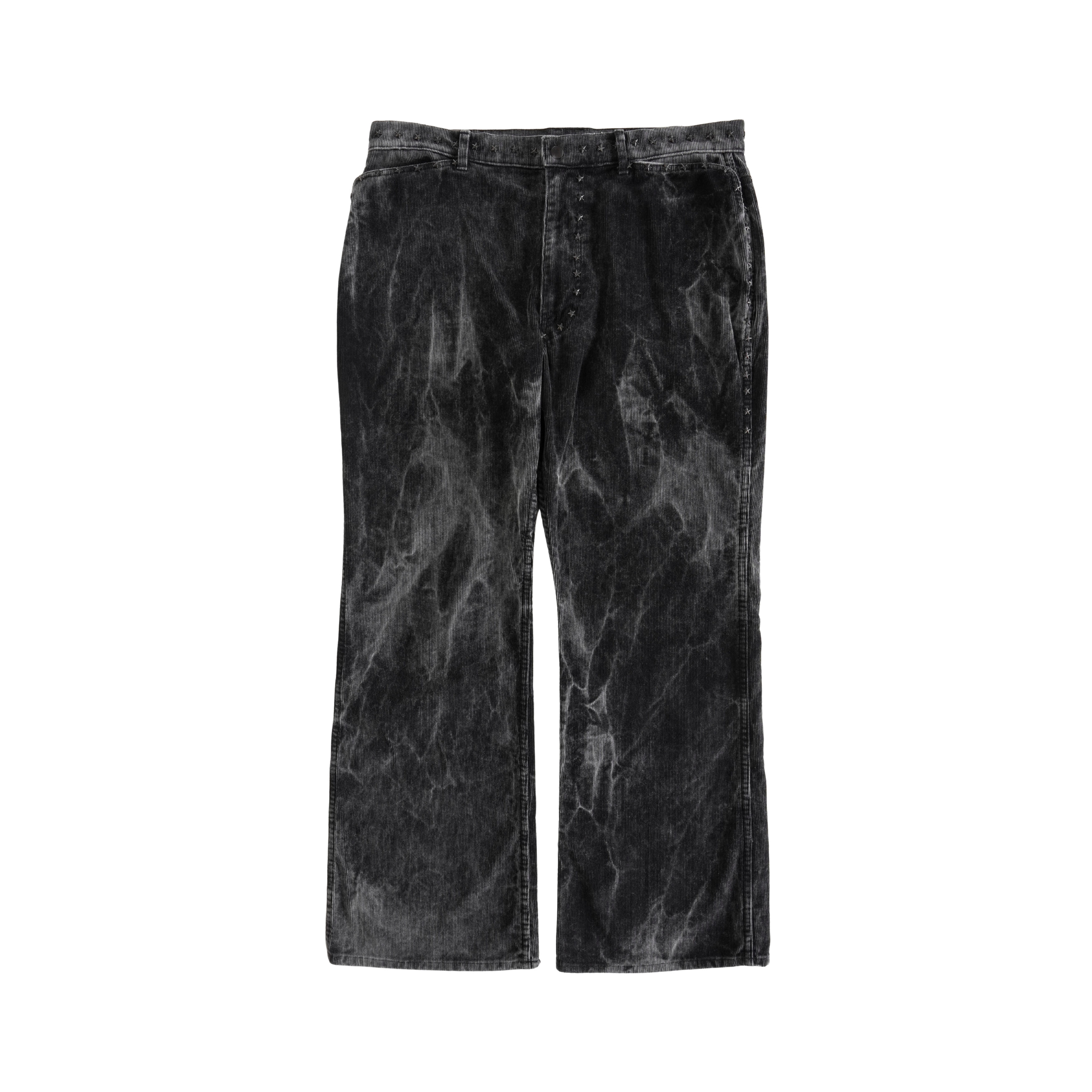 Needles flared pants in acid washed black corduroy with black metal star star studs around the waist and down the legs.