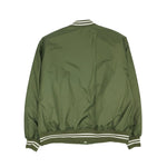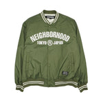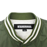 Neighborhood bomber jacket in army green nylon with green and white striped sleeve cuffs and collar. Features a snap button front closure, snapc button side pockets, and large logo on the front in white leather.
