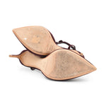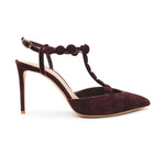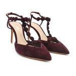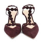 'Quantum' T-strap heels in dark burgundy suede with circle appliques on the straps and a pointed toe.