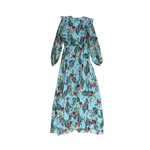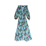 Nicholas 'Mayflower' maxi wrap dress in blue silk with a pink and green floral print with a deep v-neckline, puff sleeves with ruffle trim at the shoulders, cold shoulder cut-outs, and a wrap belt at the waist.