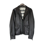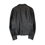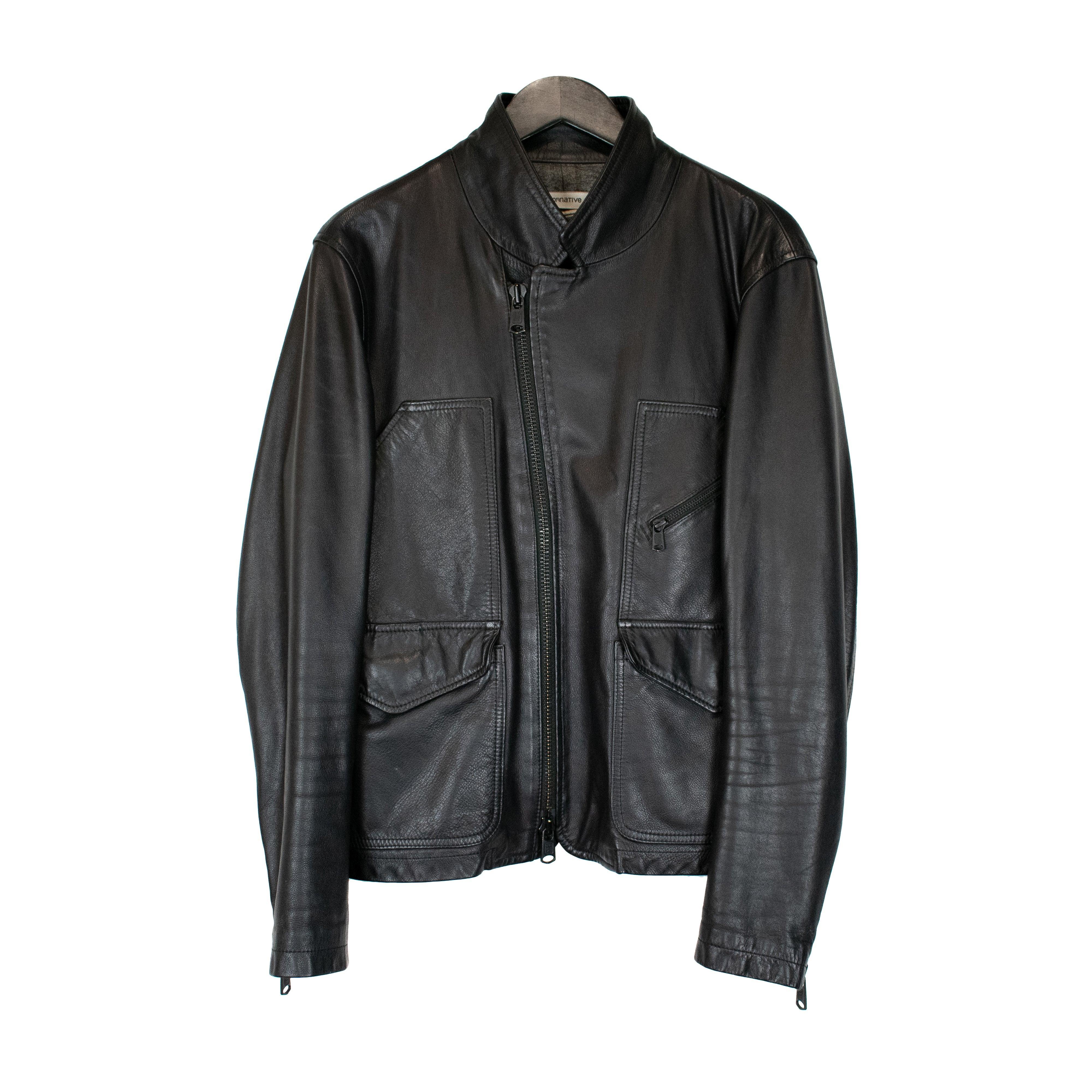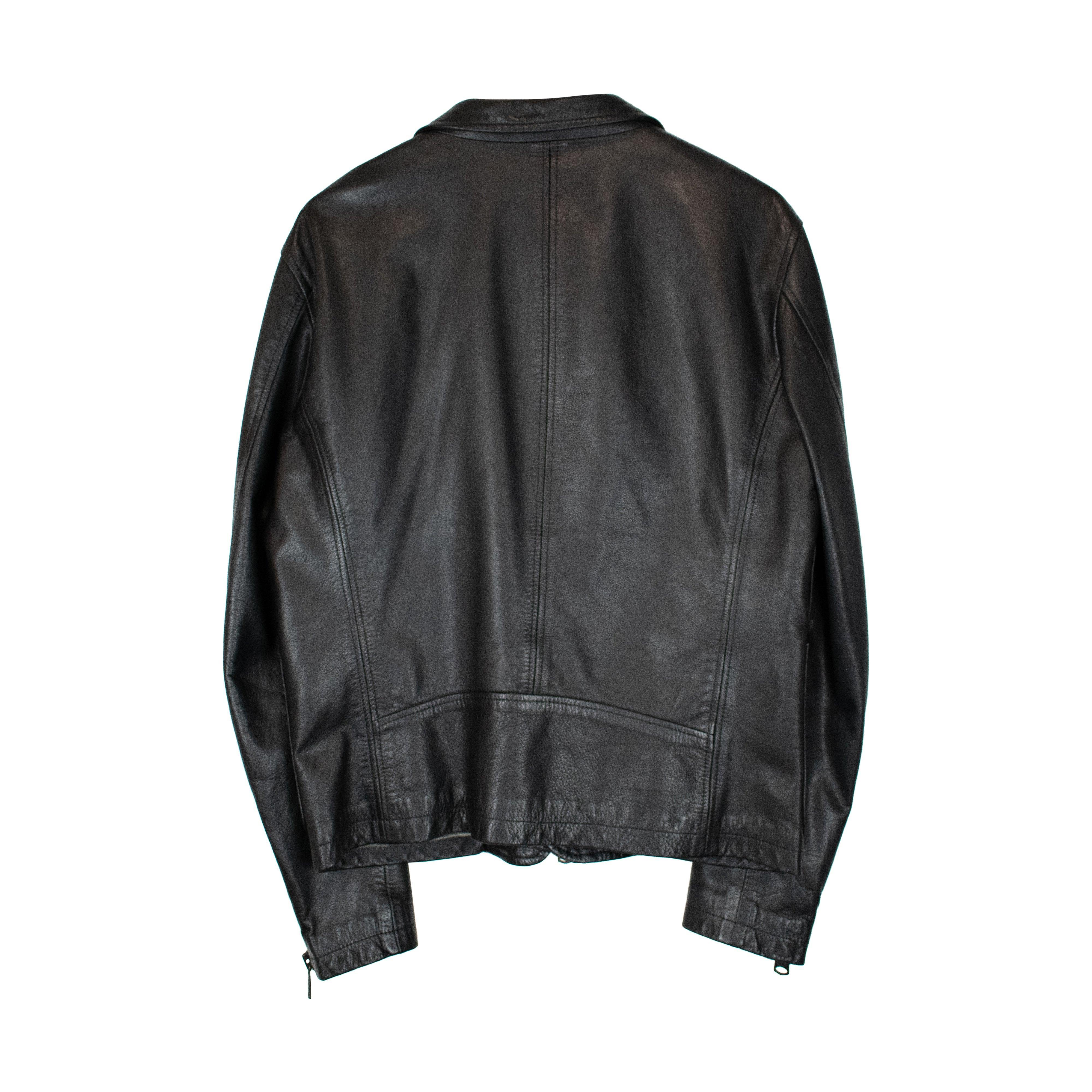 Nonnative biker jacket in black leather with matte black hardware. The interior is lined with grey striped cotton.