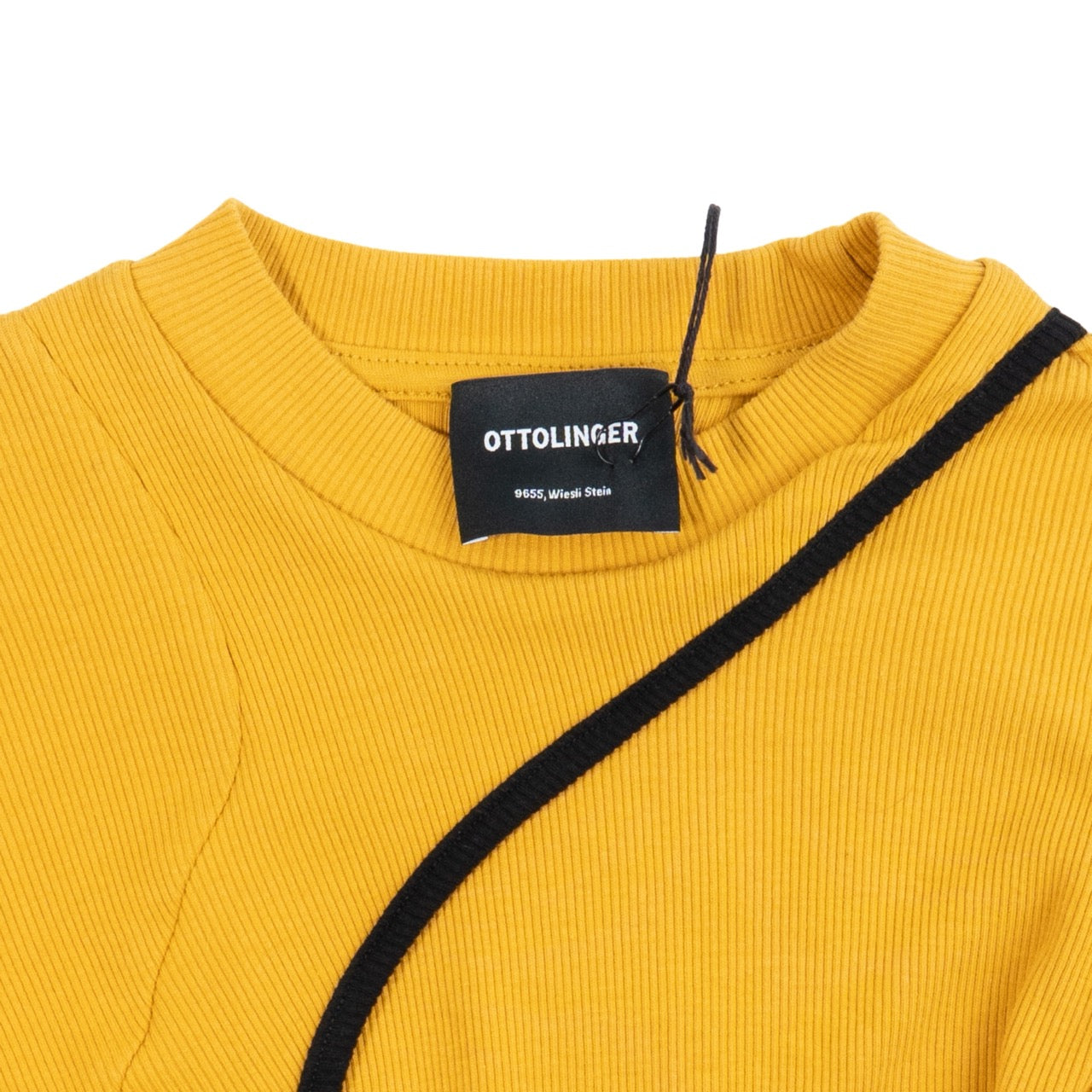 Ottolinger 'Tied-Wasit Ribbed Knit' longsleeve bodycon dress in mustard yellow ribbed knit with asymmetrical curved overlay tie panel with black piping and lettuce hem on sleeves.