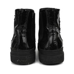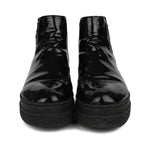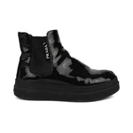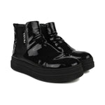 Prada 'Chelsea' Boots in black monolilith patent leather with logo embossed on the platform sole. Features elastic gusset on the sides.