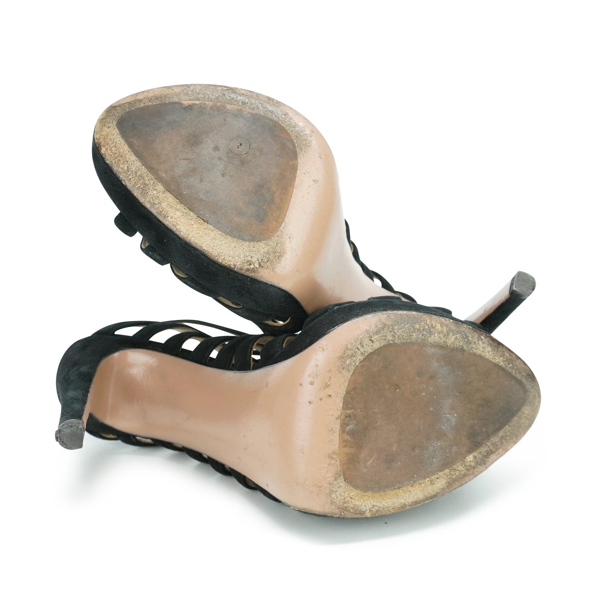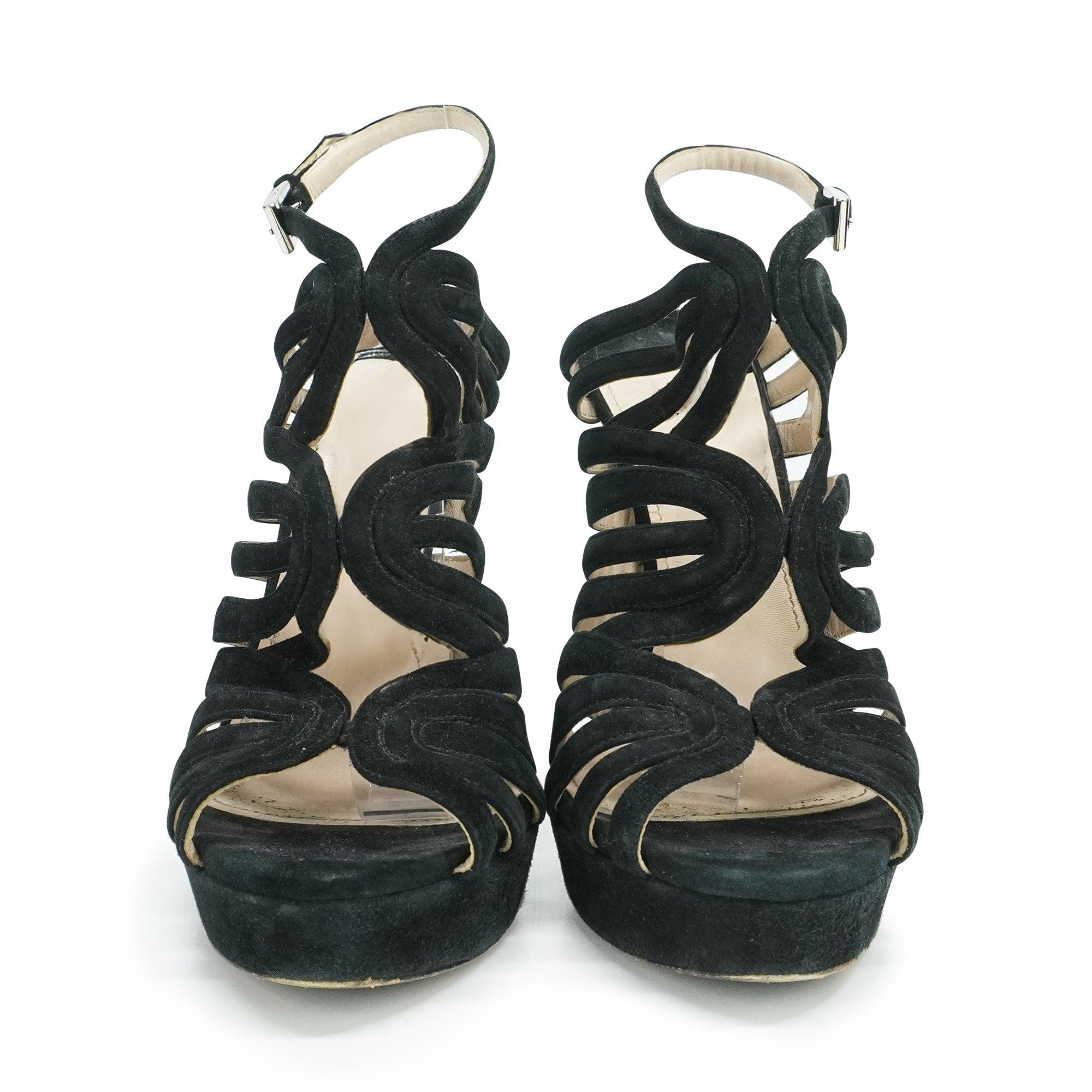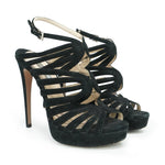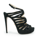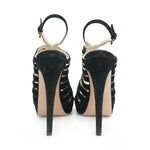 Prada Strappy peep-toe heels in black suede with cage detailing and an ankle closure in silver hardware.