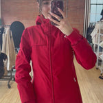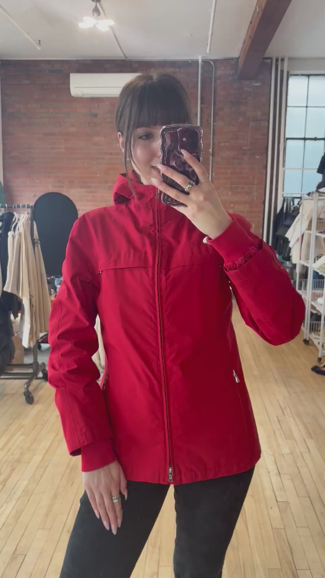 Prada rain jacket in bright red Gore-Tex nylon. Features a front zip opening in silver hardware, several zip pockets, a drawstring hood, and a tonal rubber logo on the wrist.