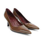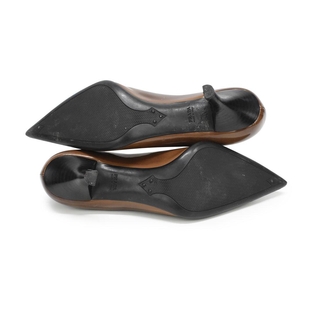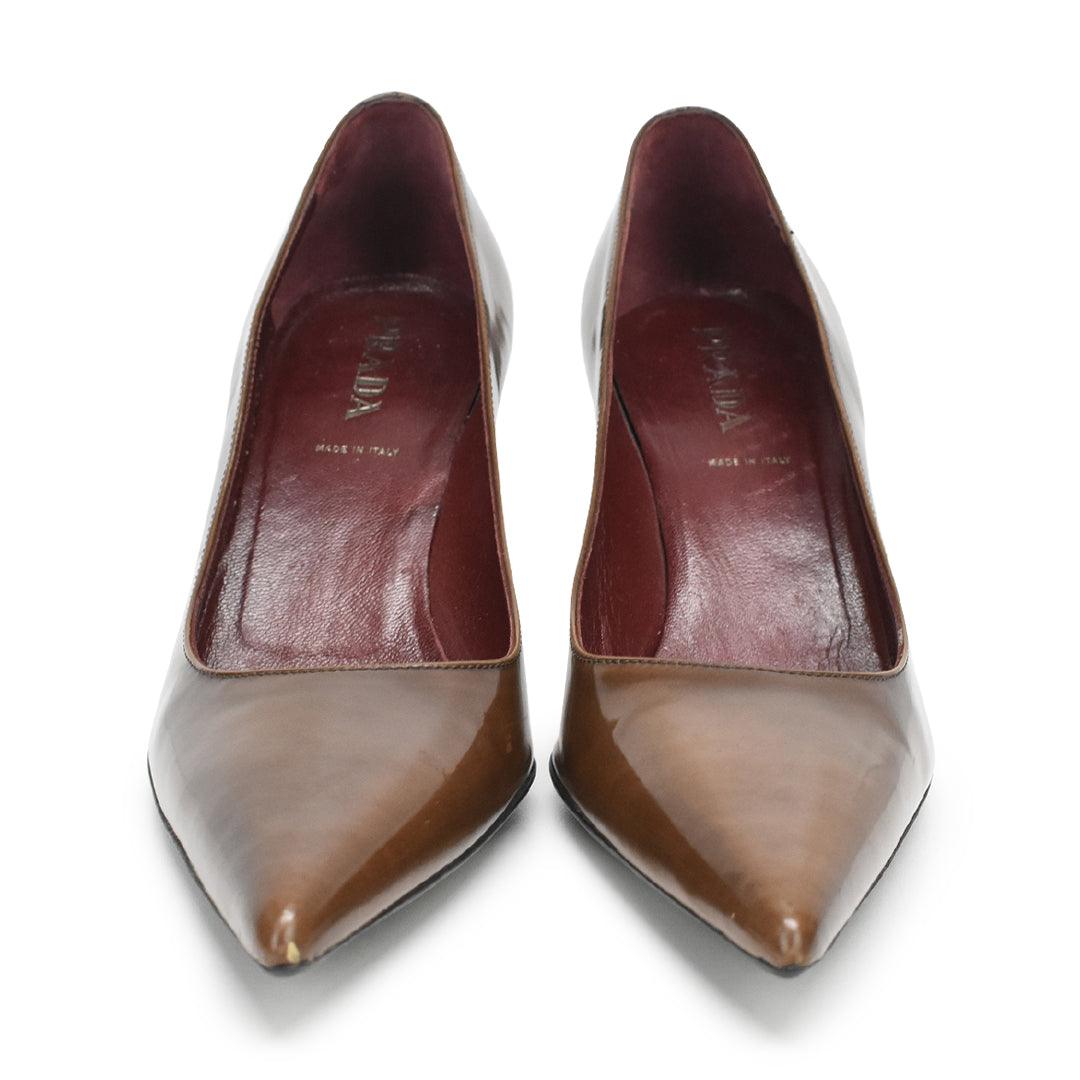 Prada pointed-toe kitten heels in brown patent leather. Features a black stacked wooden heel and burgundy red interior lining.