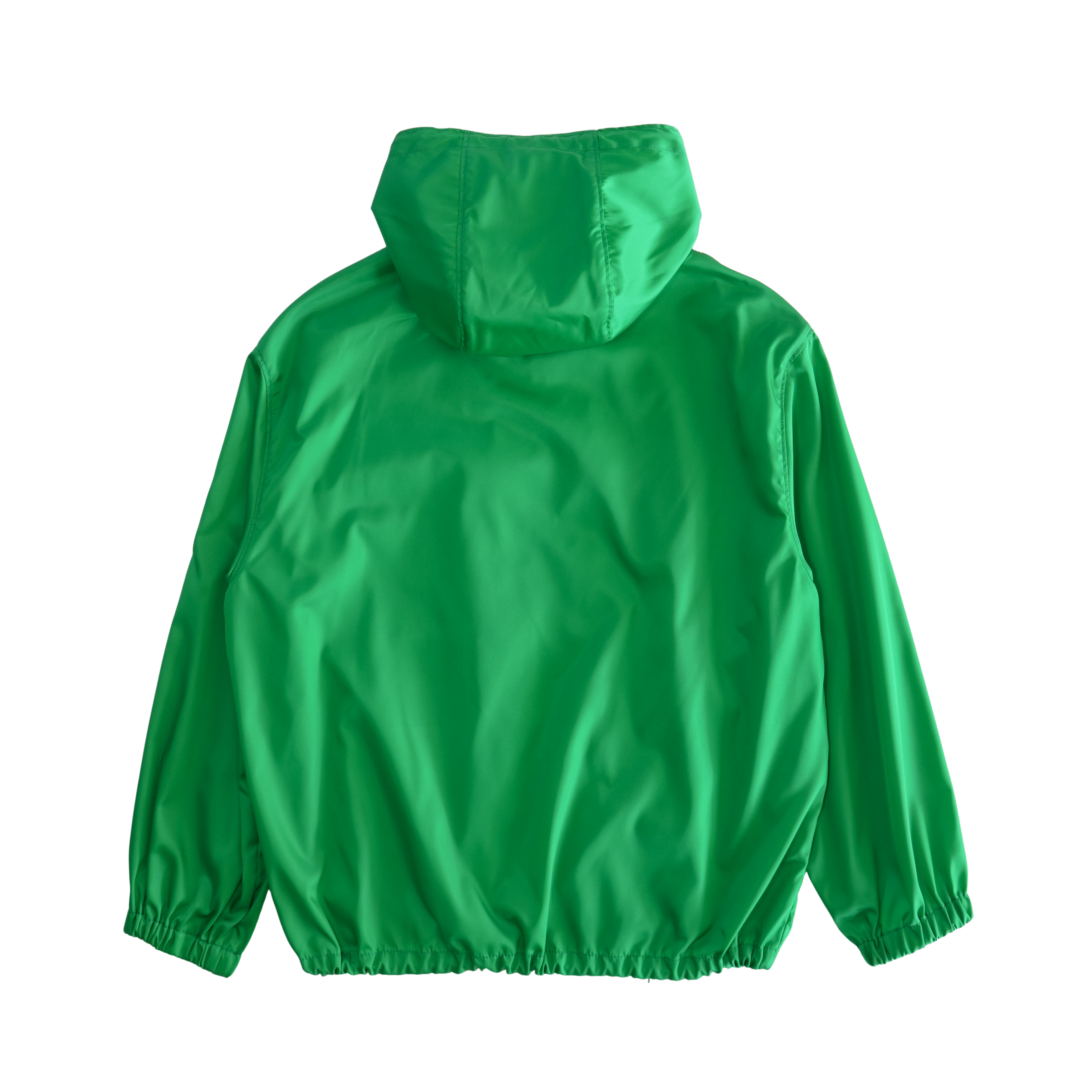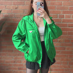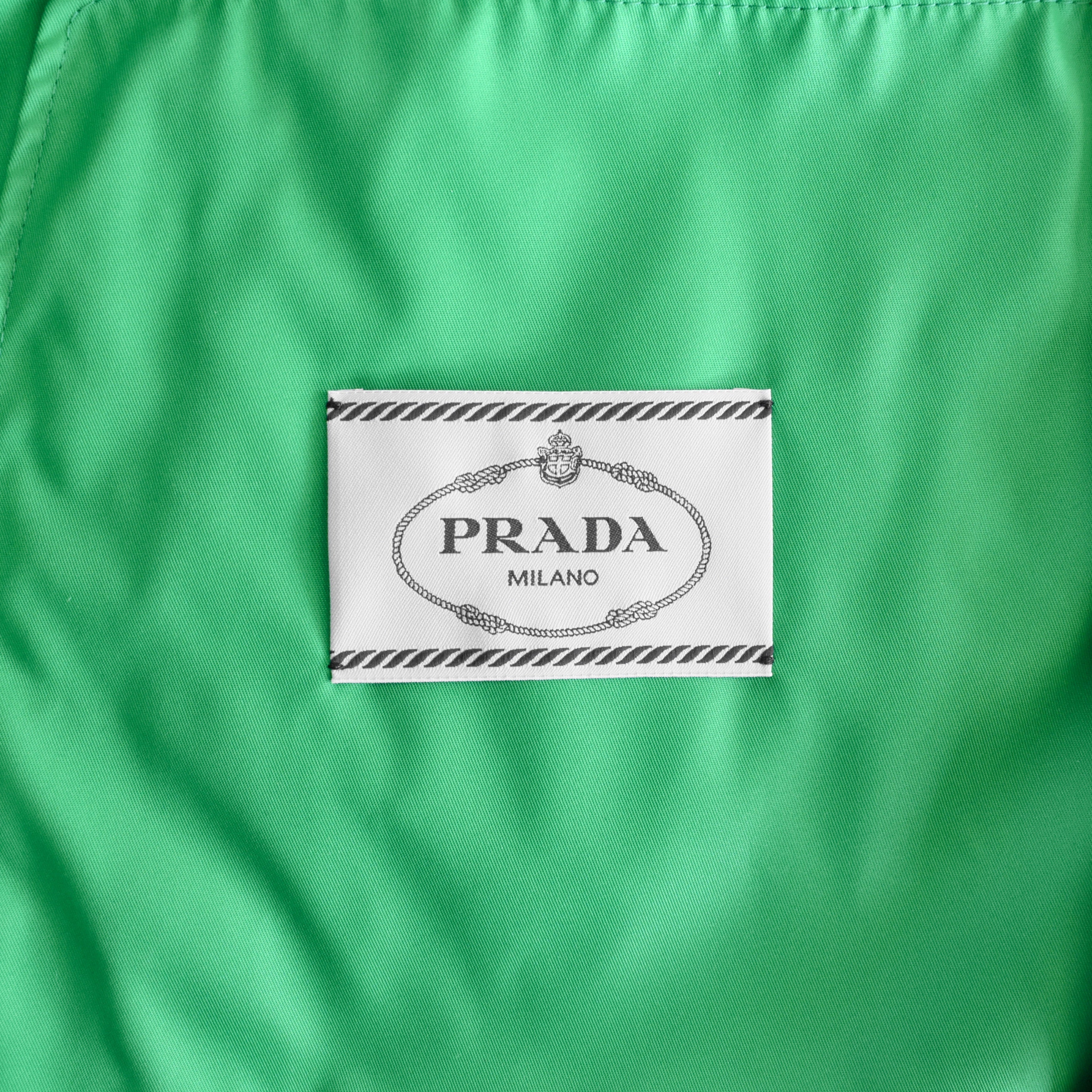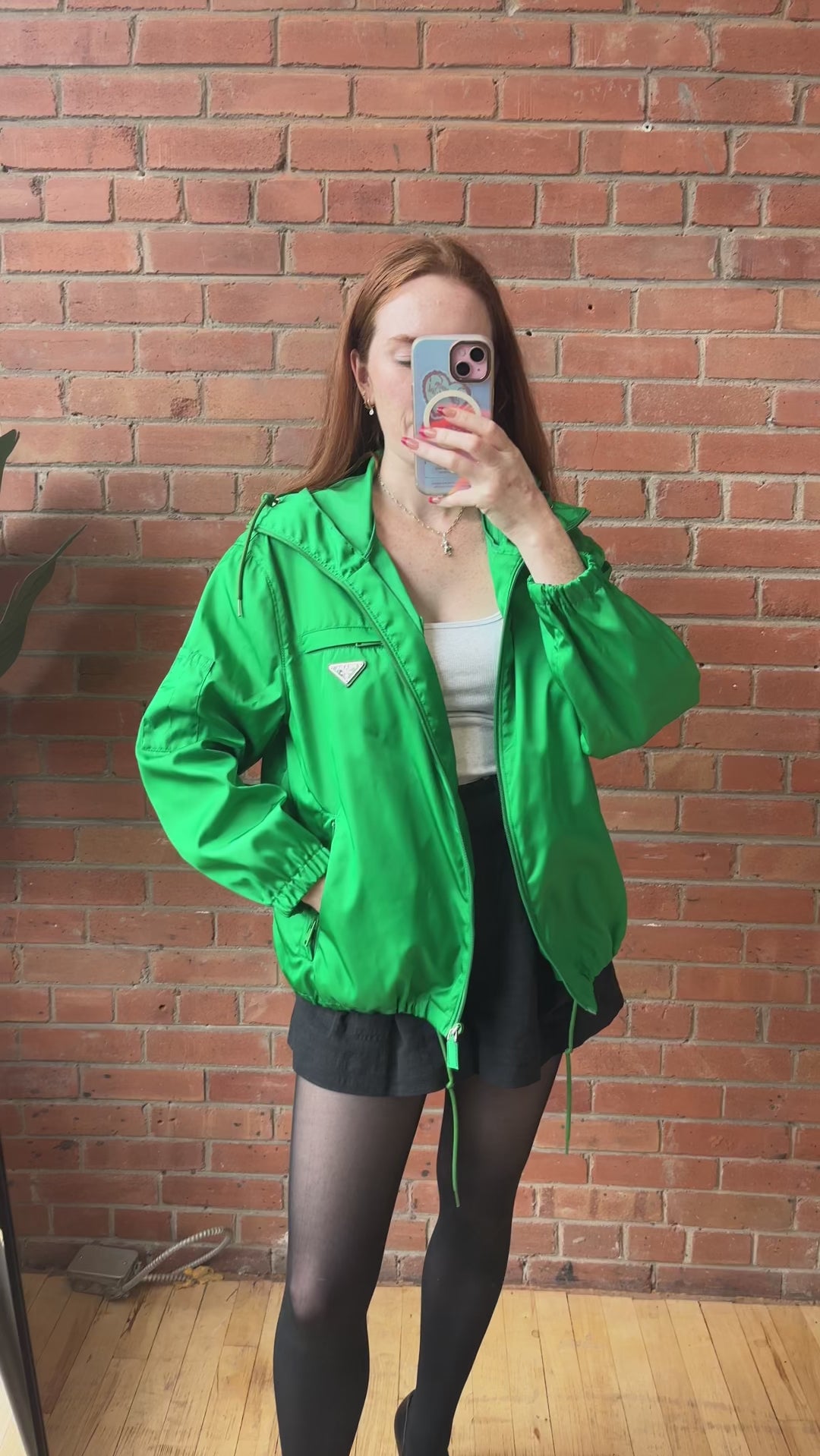 Prada 'Re-Nylon' windbreaker jacket in kelly green recycled nylon with silver triangle logo plaque. Features a front zip, 3 zip pockets, and adjustable drawstring hem.